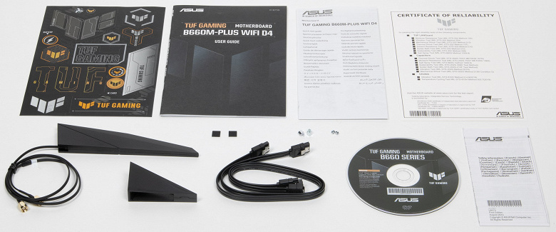 Asus TUF Gaming B660M-Plus WiFi D4 поставляется в стандартной коробке фирменного дизайна серии (в черно-серых тонах). Комплект размещен под платой в отдельном отсеке.