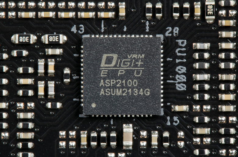 Управляет схемой питания VCore и iGPU фирменный ШИМ-контроллер Digi+ ASP2100.