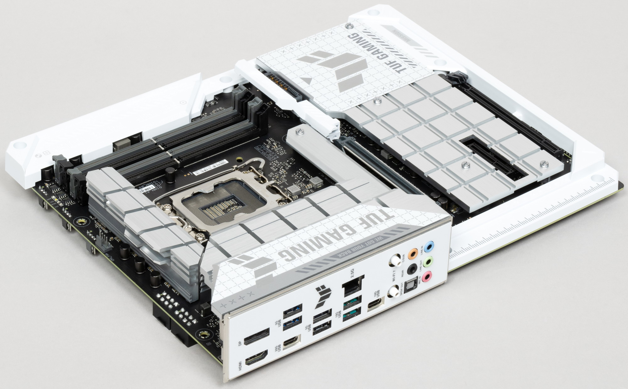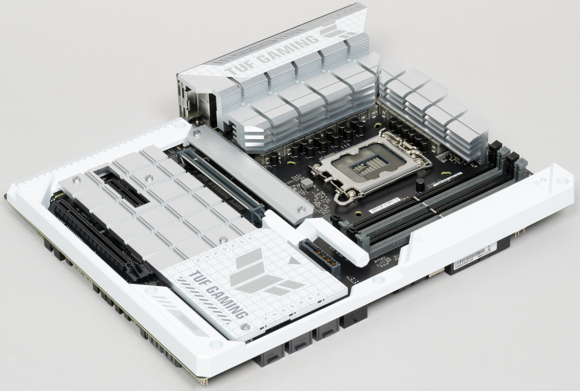 Плата поставляется в стандартной коробке фирменного дизайна серии TUF Gaming (бело-серый дизайн подчеркивает общую цветовую гамму продукта). Комплект размещен под платой в отдельном отсеке.