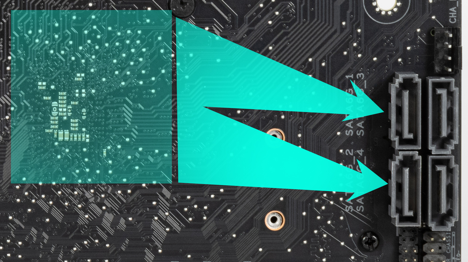 Всего у платы 4 разъема Serial ATA 6 Гбит/с + 4 слота для накопителей в форм-факторе M.2. 4 порта SATA 1,2,3,4 реализованы через чипсет Z790 и поддерживают создание RAID. Порты расположены на оборотной стороне печатной платы.