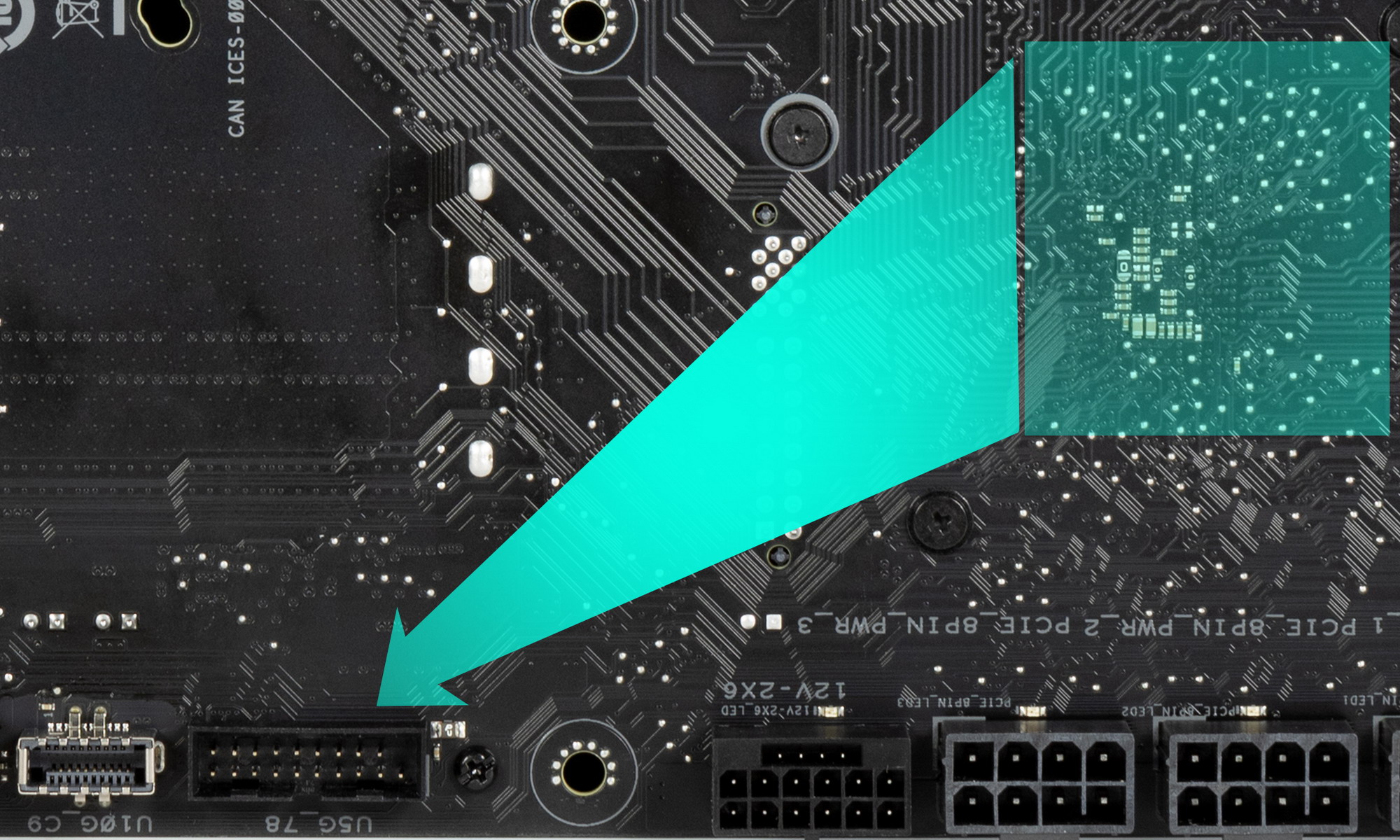 Там же мы видим уникальный разъем питания для видеокарт из такой же серии BTF (у которых нет своего коннектора питания для подключения к блоку питания, они получают питание именно через такой разъем).
