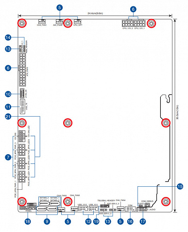 Для питания платы на ней предусмотрены 7 разъемов: в дополнение к 24-контактному ATX здесь есть еще два 8-контактных EPS12V (все три отмечены голубым и расположены на оборотной стороны платы). Однако мы помним, что плата укомплектована разъемом для питания видеокарт серии BTF, поэтому оборотная сторона содержит еще 4 разъема питания видеокарт, образующие 2 набора: первый включает 3 обычных 8-контактных разъема PCIe 2.0 (отмечены красным), а второй — современный 16-контактный разъем 12VHPWR (отмечен желтым). Использовать следует только один из этих наборов.