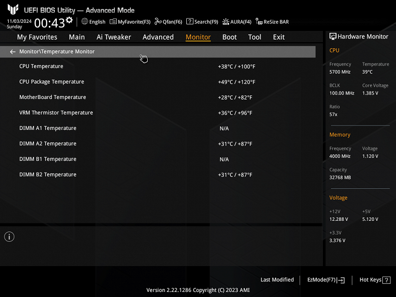 Для установки модулей памяти на плате Asus имеется четыре DIMM-слота (для работы памяти в Dual Channel в случае использования всего 2 модулей их следует устанавливать в А2 и B2 (помечены серым цветом). Плата поддерживает небуферизованную память DDR5 (non-EСС), а максимальный объем памяти составляет 192 ГБ. Поддерживаются профили XMP.