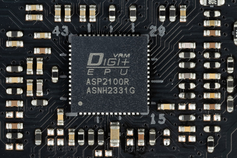 Управляет схемой фирменный ШИМ-контроллер DiGi+ ASP2100R, рассчитанный максимум на 16 фаз (по разным сведениям).