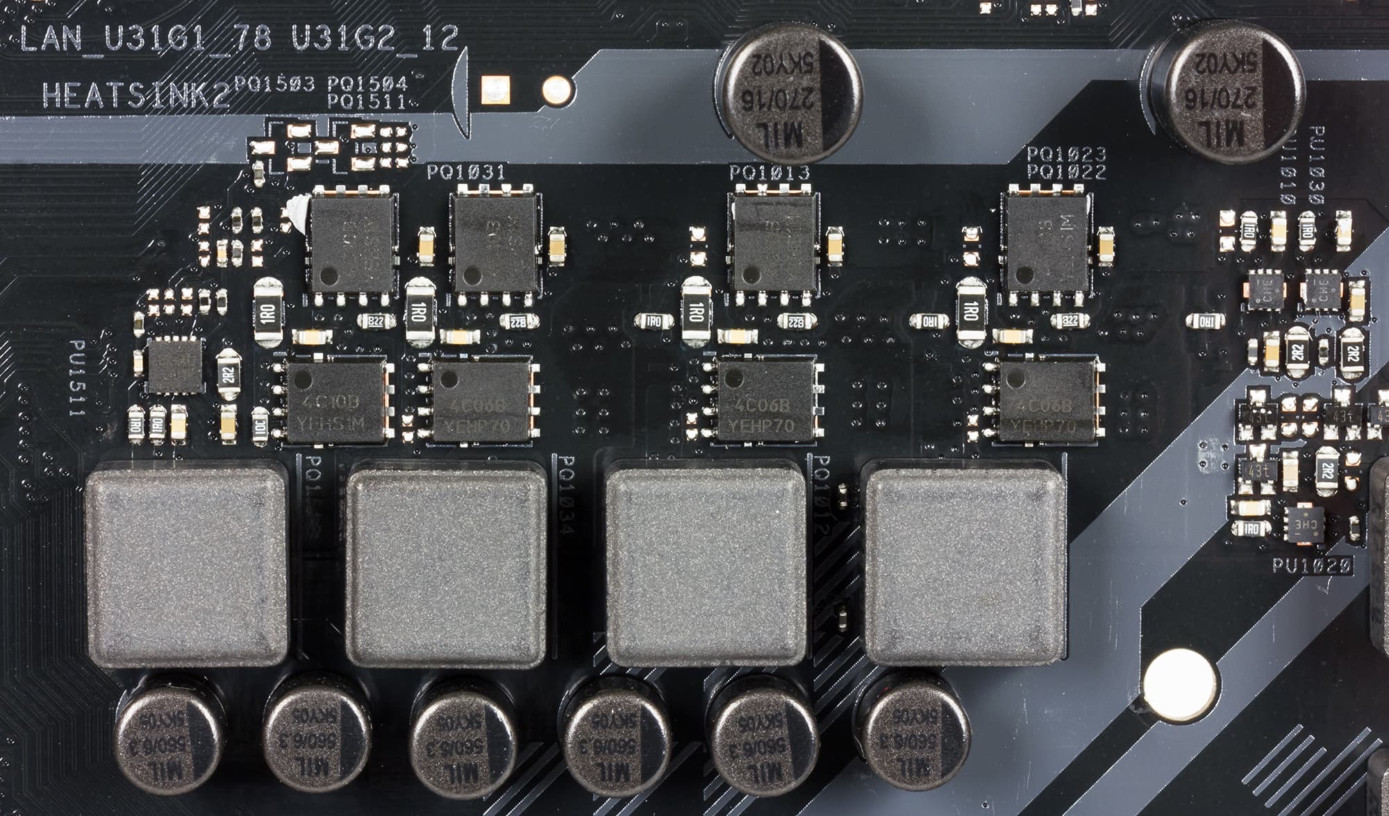 Один радиатор расположен около процессорного разъема и предназначен для отвода тепла от MOSFET-транзисторов регулятора напряжения питания процессора. Этот радиатор закрывает MOSFET-транзисторы только четырех каналов питания, которые используются для ядер процессора. MOSFET-транзисторы еще двух каналов питания ничем не закрыты.