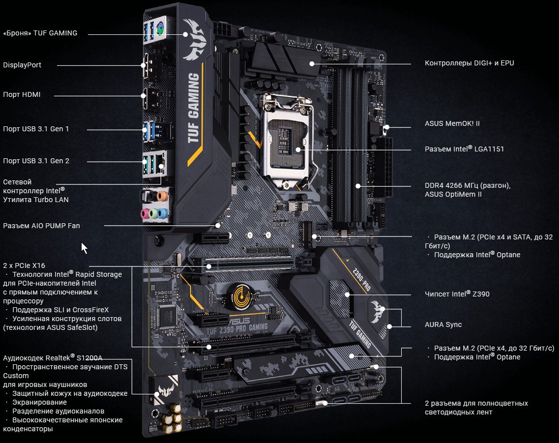 Поскольку жизнь у Z390 стала не только долгой, но и охватила уже огромный ценовой сегмент, на этом же продукте Intel основано и несколько материнских плат из серии TUF компании Asus. Напомню, что серия TUF — это геймерские продукты, однако где упор сделан не на достижение максимальных показателей производительности, включая оверклокерские «фишки», не на наличие эксклюзивных «фенечек», а просто, чтобы была стабильная и долговечная работа. Собственно, слово «TUF» обыгрывает по звучанию английское «tough» — прочный, выносливый, крепкий.