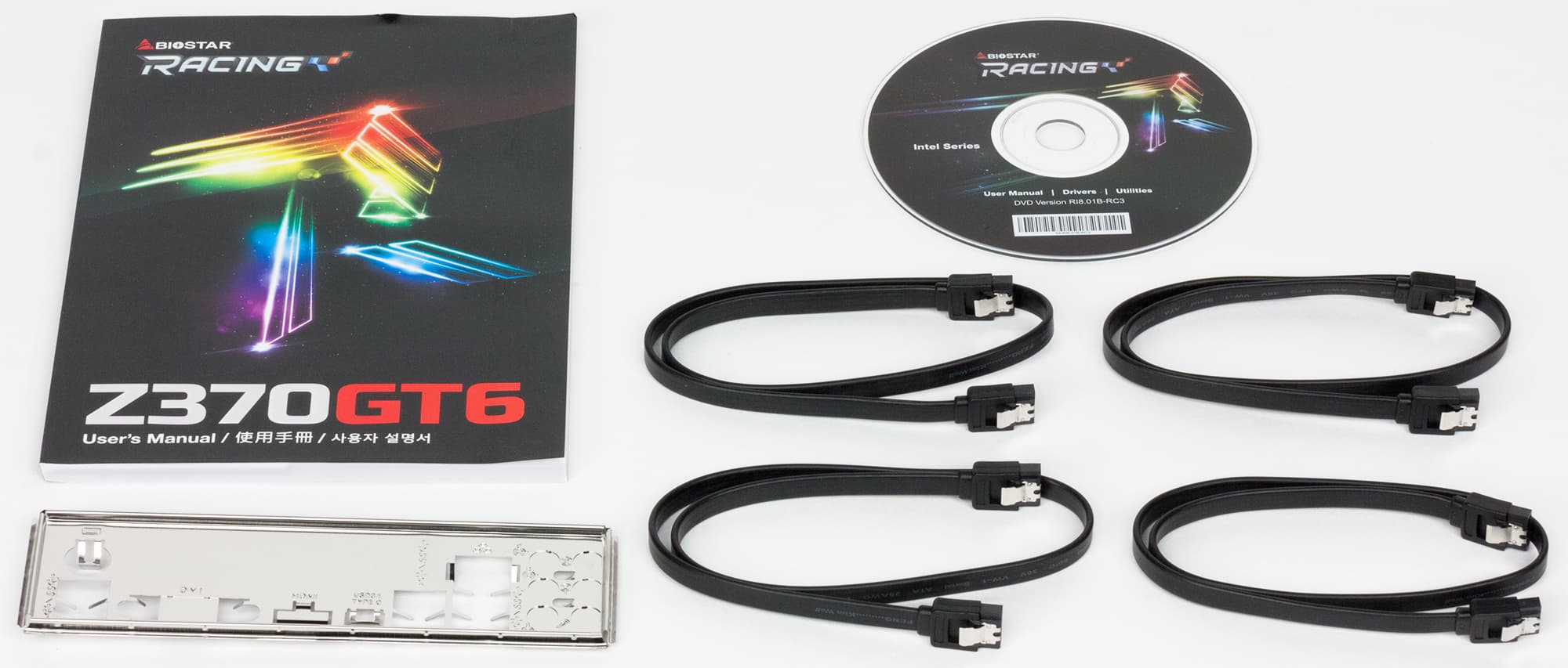 Комплект поставки очень скромный: руководство пользователя на английском, китайском и корейском языках, DVD-диск с драйверами и утилитами, четыре SATA-кабеля (все разъемы с защелками) и заглушка для задней панели платы. Вот, собственно, и все.