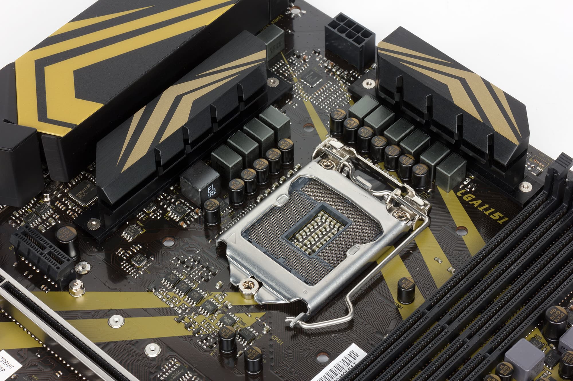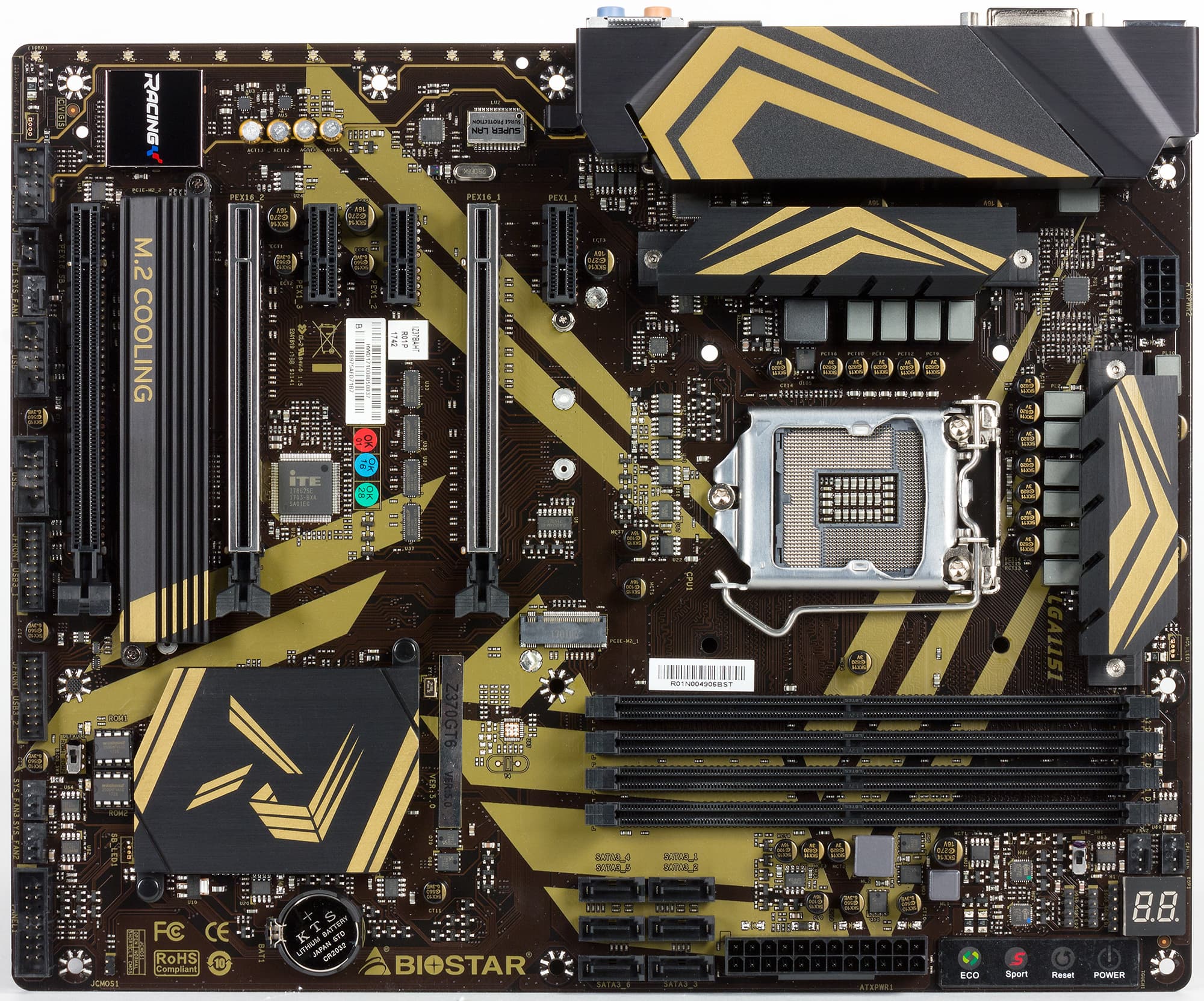 Пожалуй, одна из главных особенностей платы Biostar Racing Z370GT6 заключается в ее расцветке: текстолит имеет черно-золотой принт. (Не желтый, а именно золотой — так расцветка названа на сайте компании.) Ну, любят китайские братья все блестящее. Впрочем, сути это не меняет. Принт, конечно, оригинальный, но это не главное.