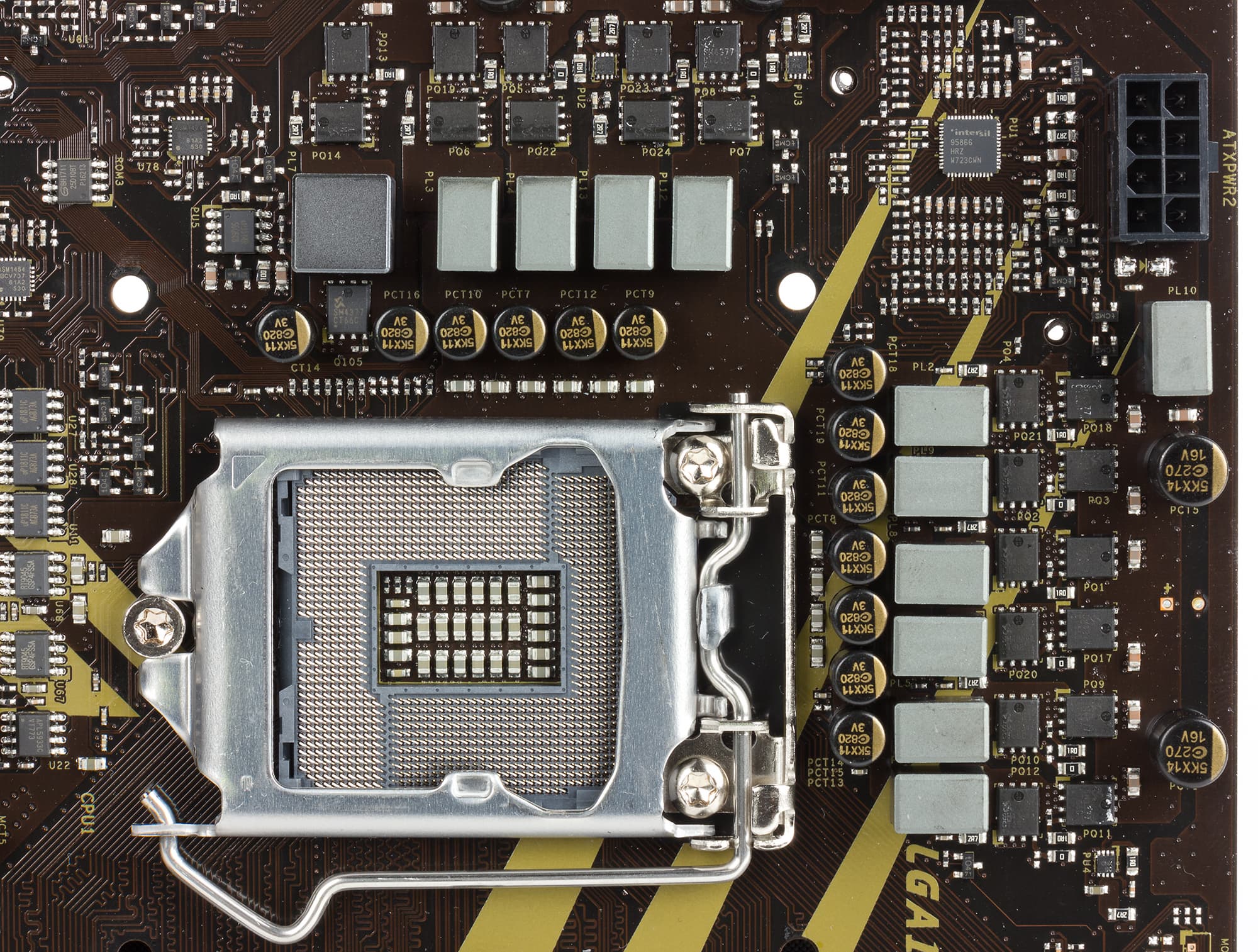 Регулятор напряжения питания процессора на плате 10-канальный и управляется PWM-контроллером Intersil ISL95866. Этот контроллер имеет два выхода. Первый выход может иметь 4, 3, 2 или 1 фазу, а второй — 3, 2 или 1 фазу. Поскольку сам PWM-контроллер Intersil ISL95866 не может обеспечить 10 каналов питания, на плате есть три удвоителя фаз питания. В каналах питания используются MOSFET-транзисторы Sinopower SM4377 и SM4364A.