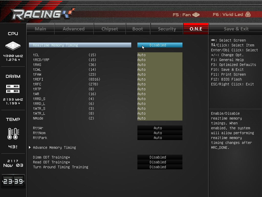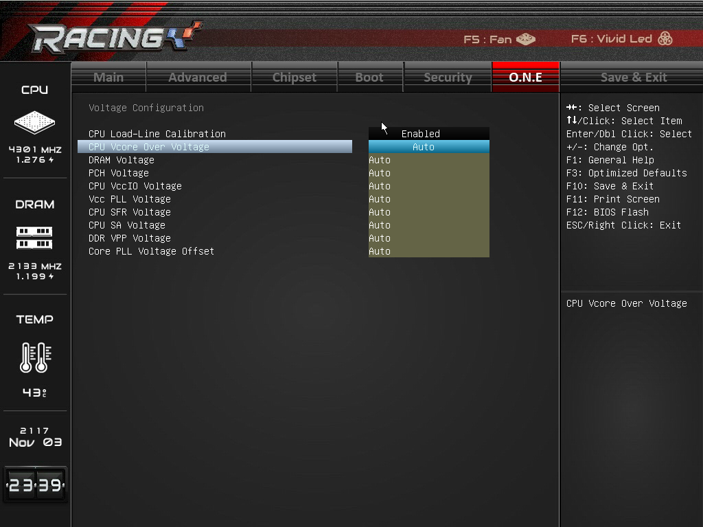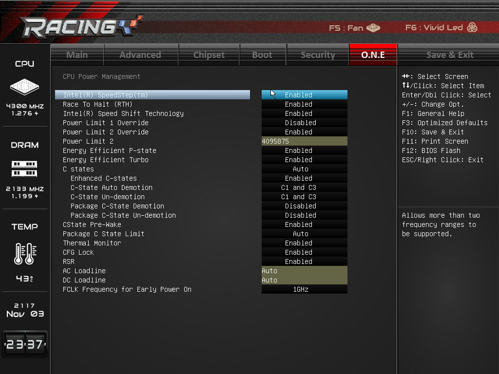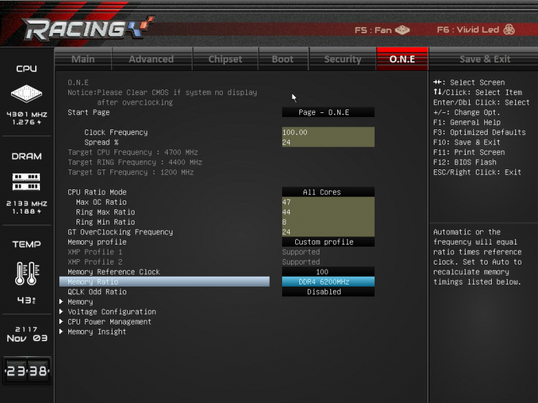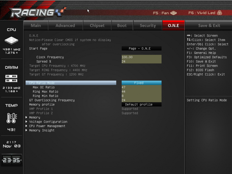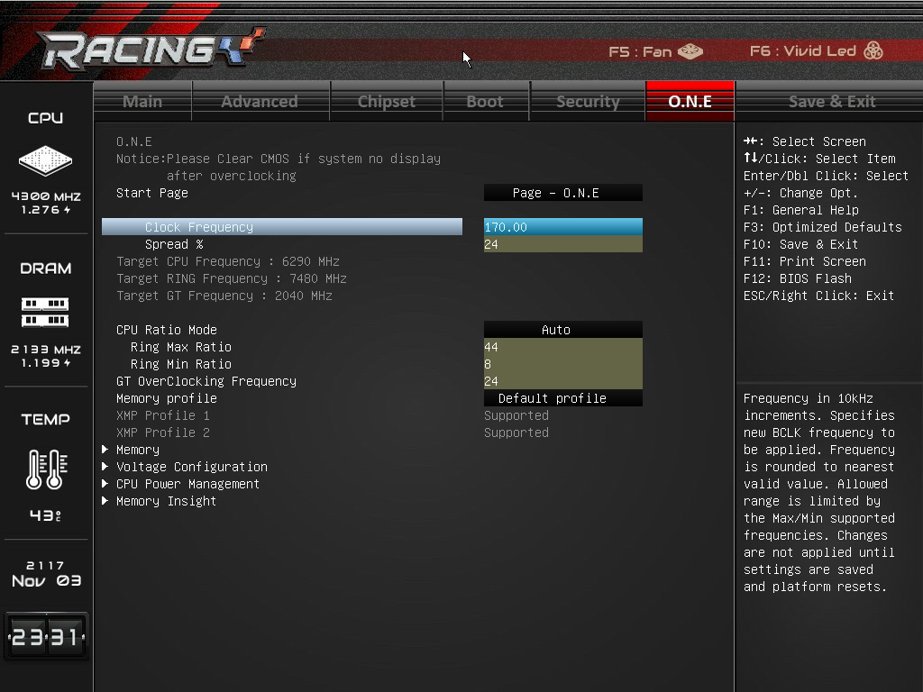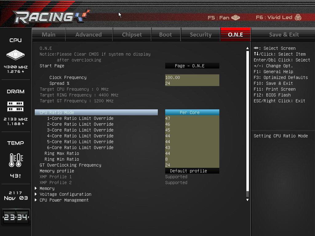 Пропуская описание вкладок Chipset, Boot и Security (здесь все стандартно), перейдем сразу к вкладке O.N.E, которая предназначена для разгона процессора и памяти.
