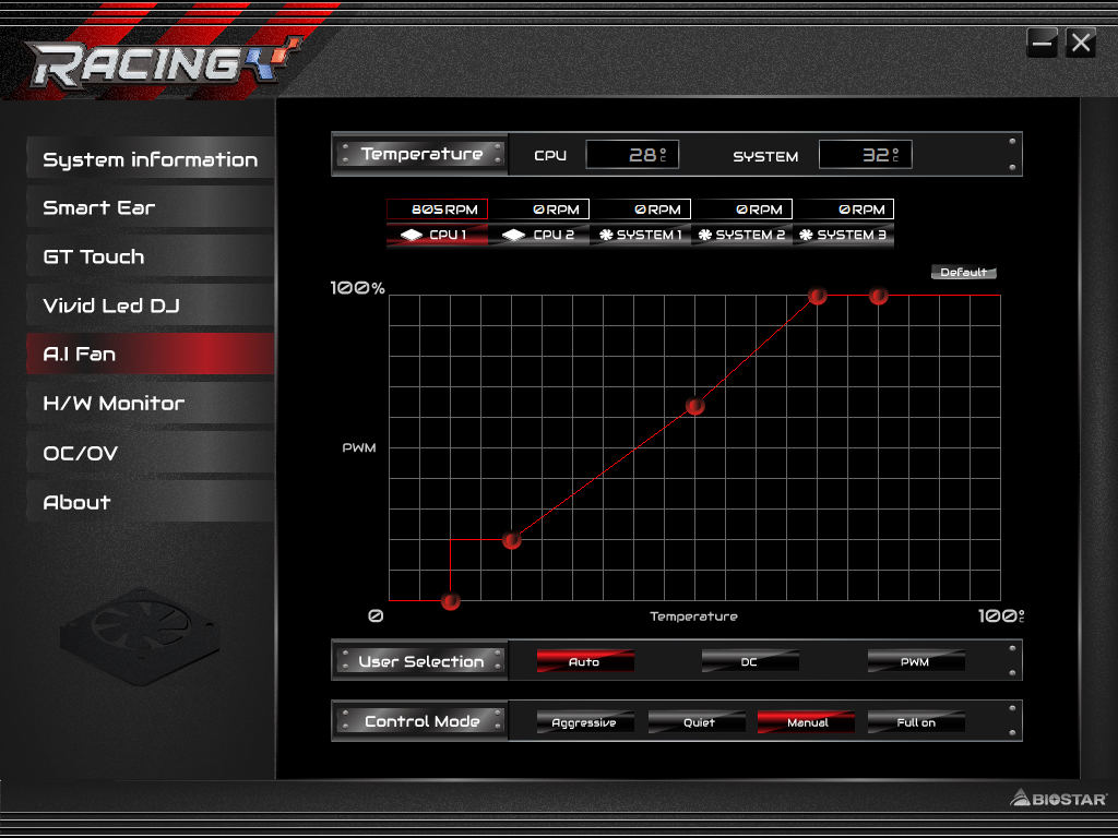 Утилита Racing GT Evo Utility позволяет также настраивать скоростной режим работы всех подключенных к плате вентиляторов. Аналогичные возможности по настройке скоростного режима работы вентиляторов есть и в UEFI BIOS Setup.