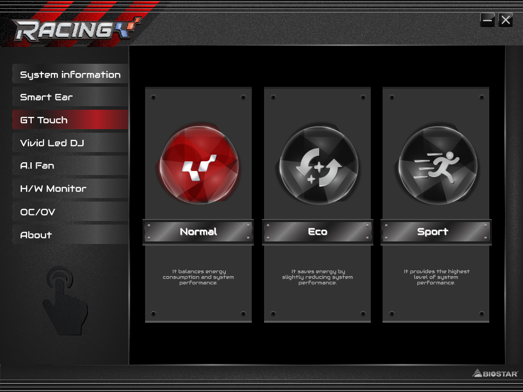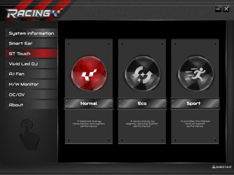 На плате есть отдельная панель GT Touch с четырьмя сенсорными кнопками. Это уже оригинально (не практично, а именно оригинально), поскольку у других производителей такого нет. Кроме стандартных кнопок включения и перезагрузки, там есть еще две кнопки: Sport и Eco. Кнопка Sport, как написано в руководстве пользователя, позволяет немного повысить производительность системы, но и приводит к повышению энергопотребления. Действие кнопки Eco диаметрально противоположное. Для того чтобы активизировать кнопки Sport и Eco, нужно предварительно установить Windows-утилиту Racing GT Evo Utility.