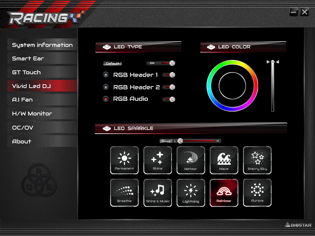 С использованием утилиты Racing GT Evo Utility (закладка Vivid LED DJ), можно управлять подсветкой, то есть выбирать эффекты свечения и цвет.