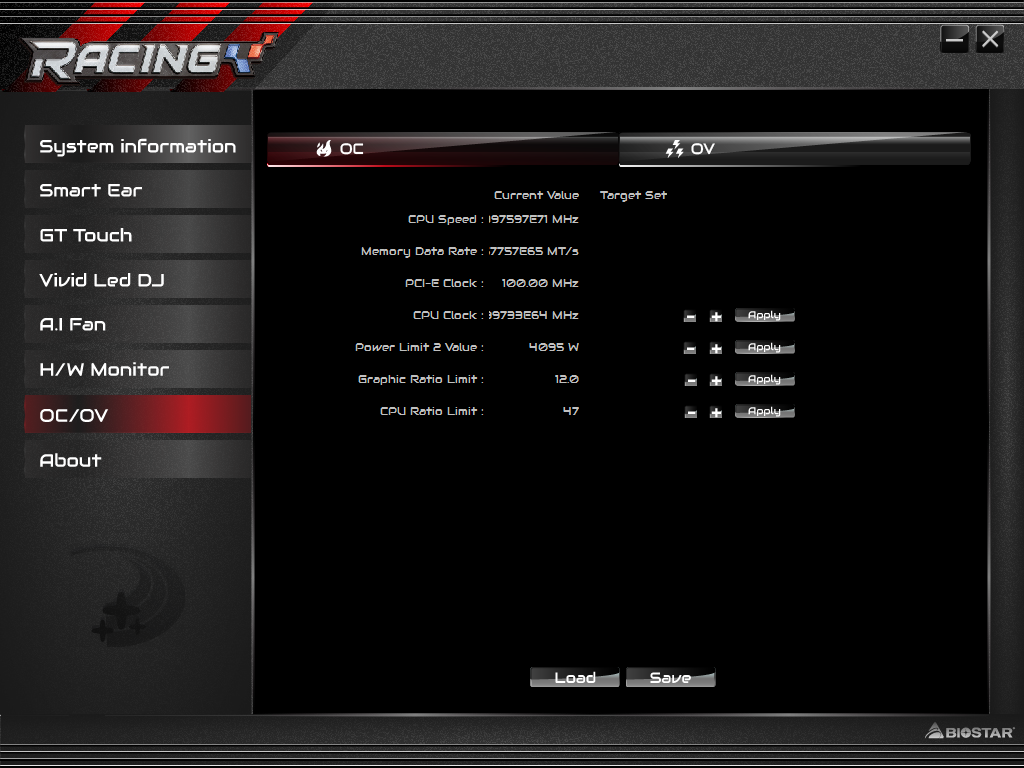 В утилите Racing GT Evo Utility предусмотрены и другие возможности по настройке системы. В частности, есть отдельная вкладка для разгона процессора (OC/OV). Насколько корректная информация отображается на этой вкладке, можно понять по приведенной иллюстрации.