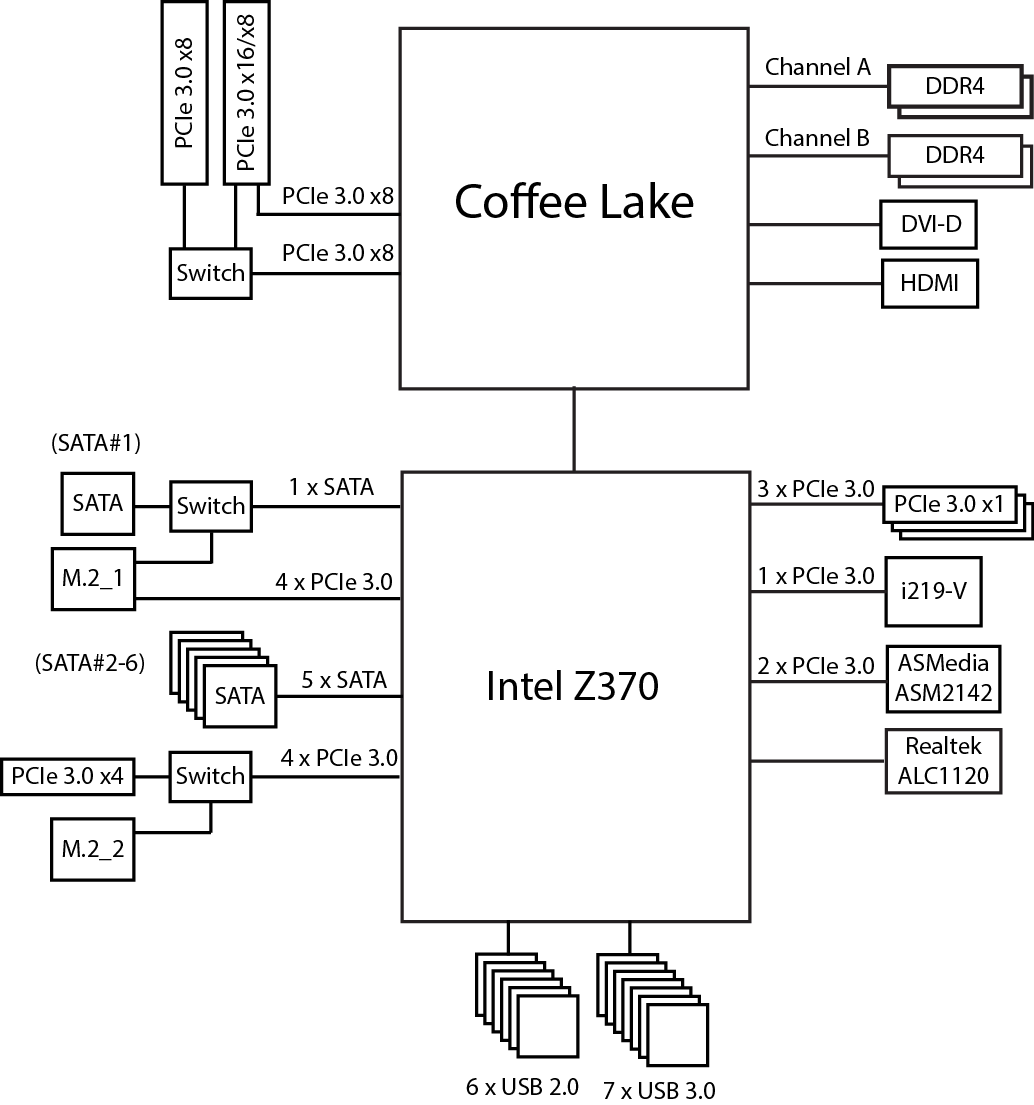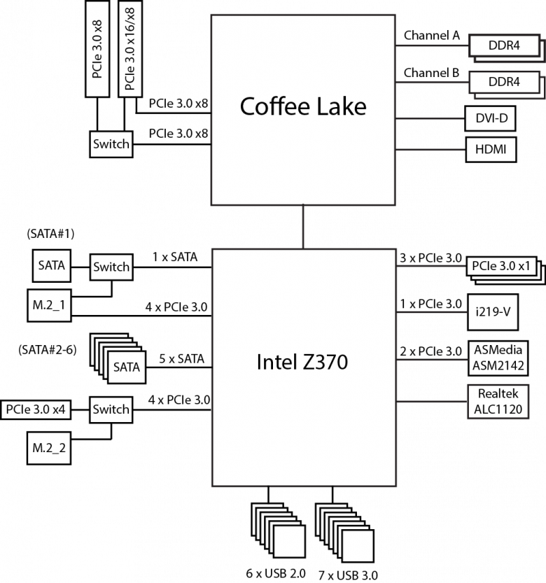 Чипсет Intel Z370 имеет 30 высокоскоростных портов ввода/вывода (HSIO), в качестве которых могут быть порты PCIe 3.0, USB 3.0 и SATA 6 Гбит/с. Часть портов строго фиксирована, но есть HSIO-порты, которые могут конфигурироваться как USB 3.0 или PCIe 3.0, SATA или PCIe 3.0. Причем всего может быть не более 10 портов USB 3.0, не более 6 портов SATA и не более 24 портов PCIe 3.0.