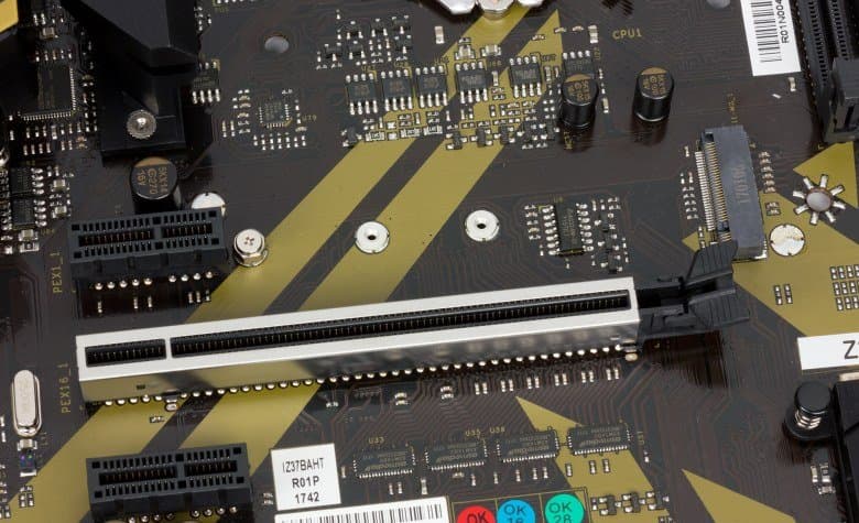 Первый (если считать от процессорного разъема) слот с форм-фактором PCI Express x16 (PEX16_1) реализован на базе процессорных линий PCIe 3.0 и представляет собой слот PCI Express 3.0 x16. Это переключаемый слот, который может работать на скоростях x16/x8. За переключение слота отвечают мультиплексоры-демультиплексоры линий PCIe 3.0 ASMedia ASM1480.