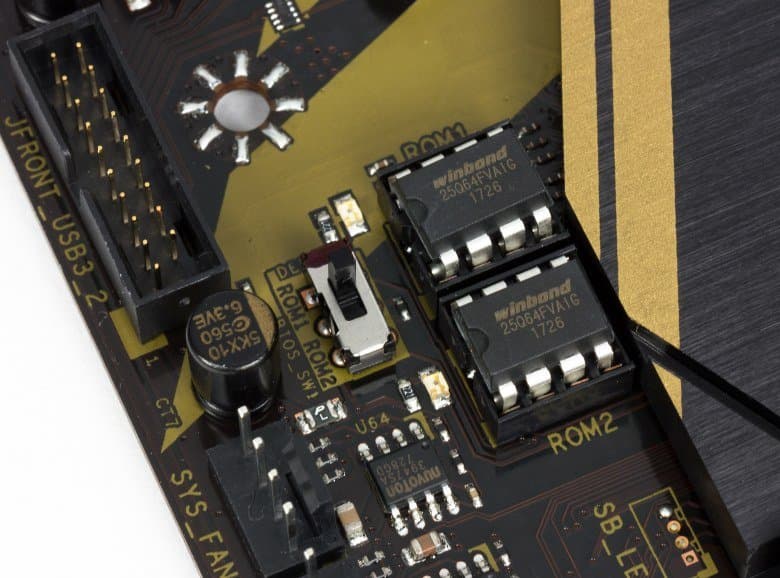 Следующая особенность — это наличие двух микросхем BIOS и переключателя, который позволяет переключаться между ними.