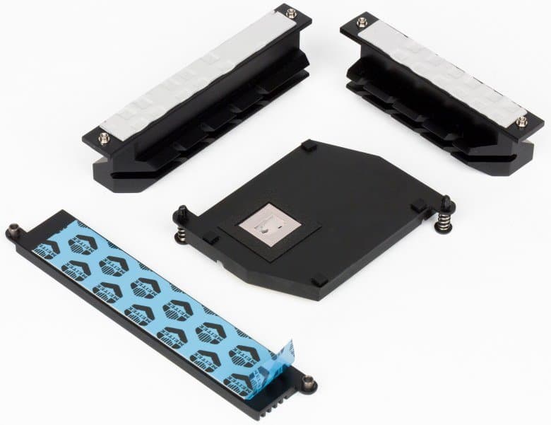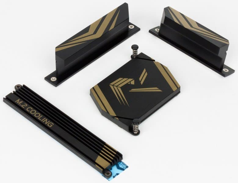 Система охлаждения платы Biostar Racing Z370GT6 состоит из четырех радиаторов. Два радиатора расположены по двум смежным сторонам процессорного разъема и предназначены для отвода тепла от MOSFET-транзисторов регулятора напряжения питания процессора. Еще один радиатор предназначен для охлаждения чипсета. И отдельный радиатор предназначен для охлаждения SSD-накопителя, устанавливаемого в один из разъемов M.2.