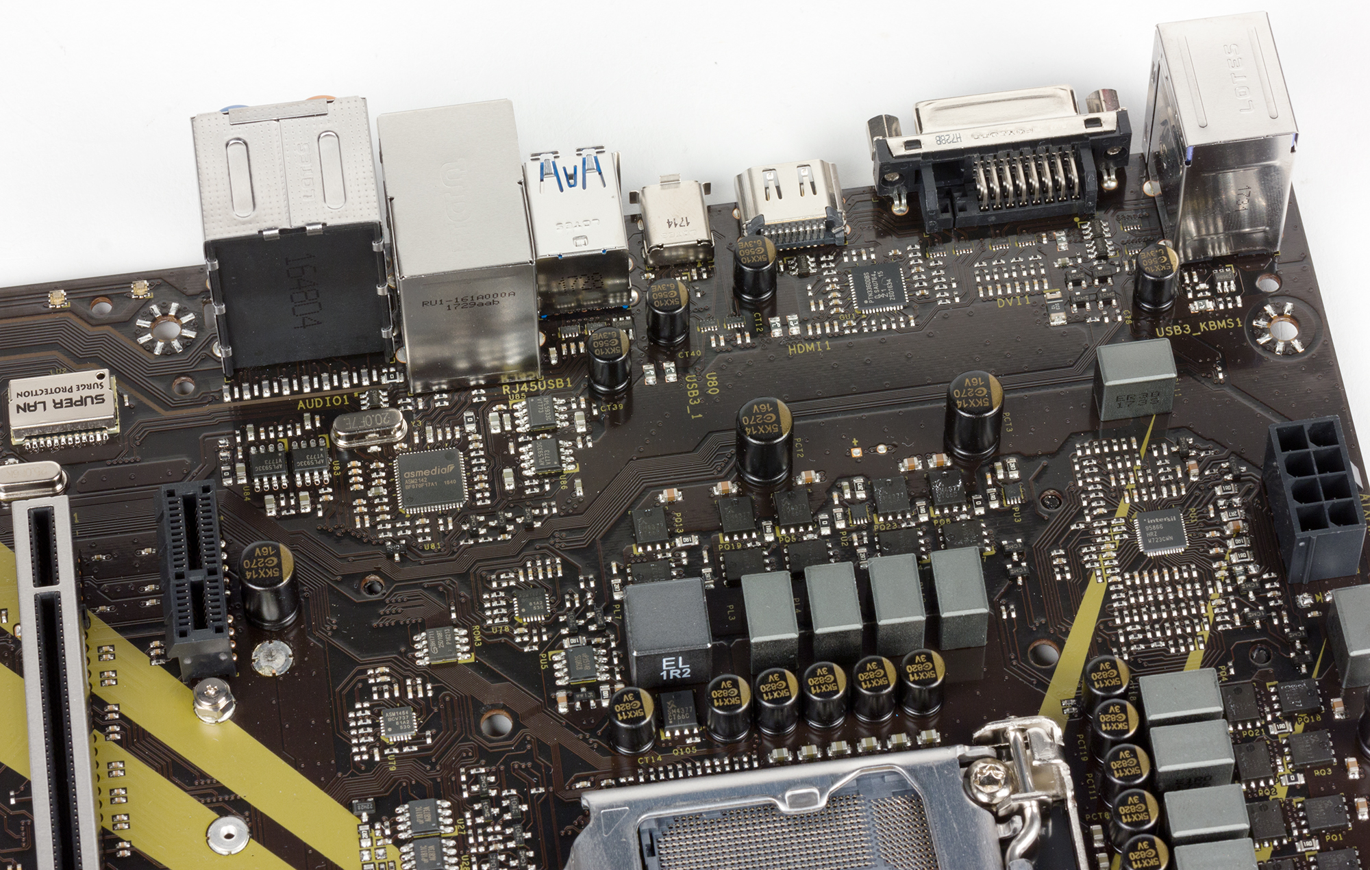 Через чипсет на плате реализованы: слот PCI Express 3.0 x4, три слота PCI Express 3.0 x1, два разъема M.2 для SSD-накопителей, гигабитный сетевой контроллер и контроллер ASMedia ASM2142.