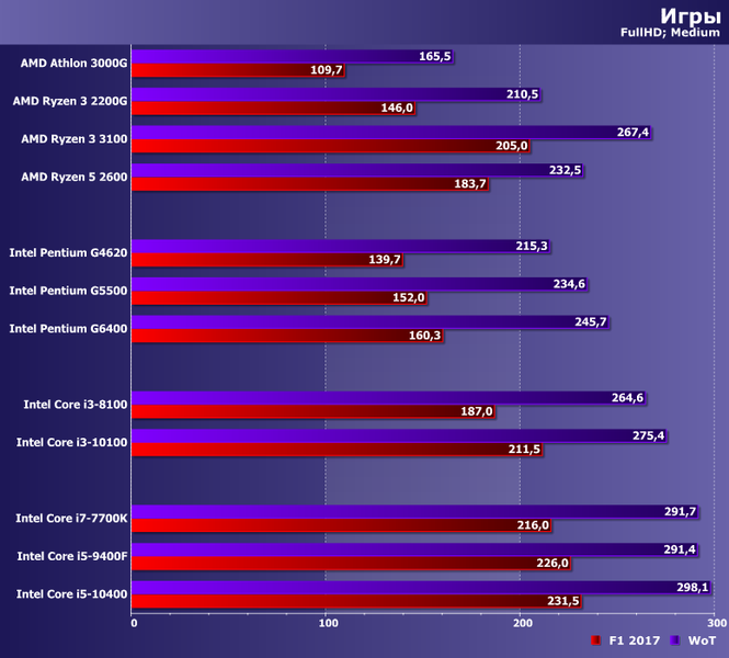 По производительности Core i3-10100 скорее ближе к старому i7-6700, чем к 7700К, но существенного значения это не имеет. Главное — он все-таки немного медленнее, чем Ryzen 3 3100. Можно, правда, вспомнить о наличии встроенного GPU — что в настоящее время великое дело, но делает процессоры не совсем прямыми конкурентами. Однако тогда нужно будет вспоминать и Ryzen 3 4350G — где видеочасть еще жирнее. И вообще — это все вопрос отдельный, требующий отдельного же изучения (в скором времени планируем заняться). С дискретной видеокартой — расклад такой. Заодно объясняющий — почему в AMD взяли паузу с обновлением бюджетных продуктов: двух ядер Zen с поддержкой SMT достаточно для беспроблемной конкуренции с любыми Celeron, а четыре таковых без SMT — спокойно справляются с Pentium. Intel постоянно обновляет процессоры этих семейств — но на производительности это практически не сказывается. И все, что требуется в таких условиях AMD — гибко варьировать цены на старые (технически) продукты, иногда их творчески переименовывая (например четырехъядерный Athlon Gold Pro 3150G — это все тот же Ryzen 3 2200G трехлетней давности, но с порезанным GPU). Вот Core i3 существенно изменились за последние три года — поэтому и новые Ryzen 3 совсем непохожи на старые. По производительности они больше напоминают старые Ryzen 5 — причем даже не четырехъядерные. Ну а что касается сравнения линеек на LGA1200, то тут вообще все просто: Core i3 вдвое быстрее Pentium, но в полтора раза медленнее Core i5. Соответствие с количеством ядер близкое к идеальному.