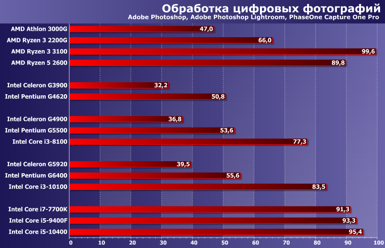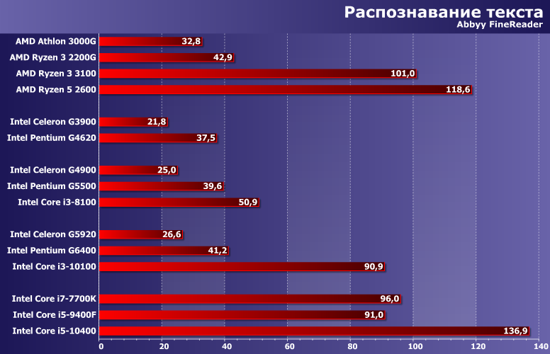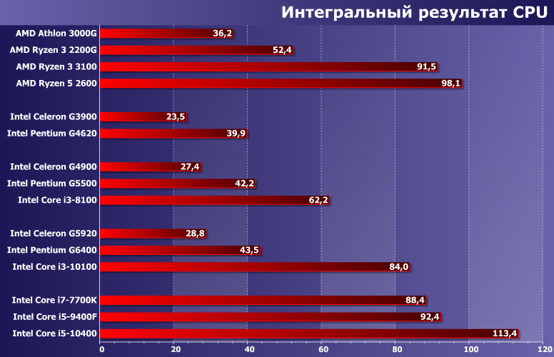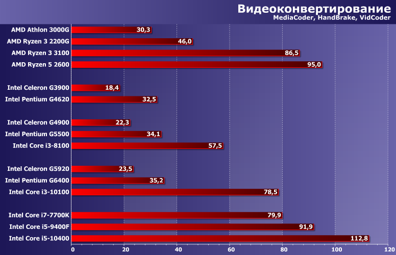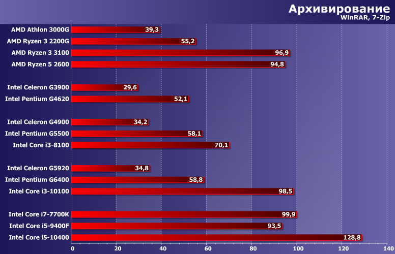 Равно как и без сравнения с процессорами AMD не обойтись, но тут «правильный» подбор моделей достаточно сложен. Поэтому мы просто волюнтаристски взяли четыре процессора. Athlon 3000G — как альтернативу Celeron. Ryzen 3 2200G — цена некоторых представителей семейства «Ryzen 3 на старых ядрах» на уровне младших Pentium, а производительность процессорной части у них у всех сопоставимая. Ryzen 3 3100 — прямой конкурент Core i3-10100. И... еще один прямой конкурент этому процессору по цене, но шестиядерный: Ryzen 5 2600. В принципе, там уже и до Ryzen 5 3600 недалеко, благо в последнее время сильно подешевел (особенно благодаря ситуации с видеокартами), но его добавлять не интересно — и без того ясно, что самый быстрый (даже i5-10400 все равно медленнее). Главная тема — бюджетный сегмент, а тут у AMD нового ничего и не было с середины прошлого года, да и тогда ассортимент пополнили парой моделей (потом еще вышло несколько интересных APU, но их доступность ограниченная). В основном приходится «отдуваться» старым микроархитектурам, но смотреть на них в исполнении 4С/8Т уже надоело.