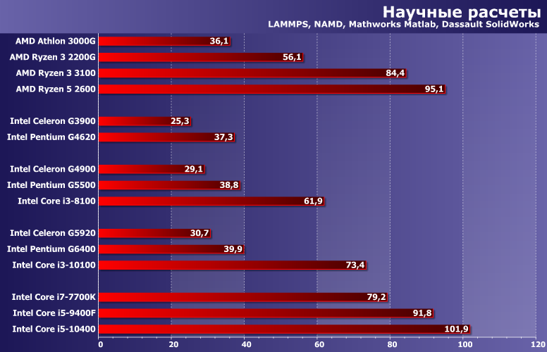 С одной стороны, неважно чего — важно сколько. С другой — архитектурные особенности, да и система памяти значение имеют. Но в процессорах Intel трех младших линеек продолжает жить все тот же Skylake — так что для них действительно важнее всего сколько. Тем более, здесь специфика кода такая, что Hyper-Threading «настоящим» ядрам уступает лишь незначительно. Поэтому и расклад такой.