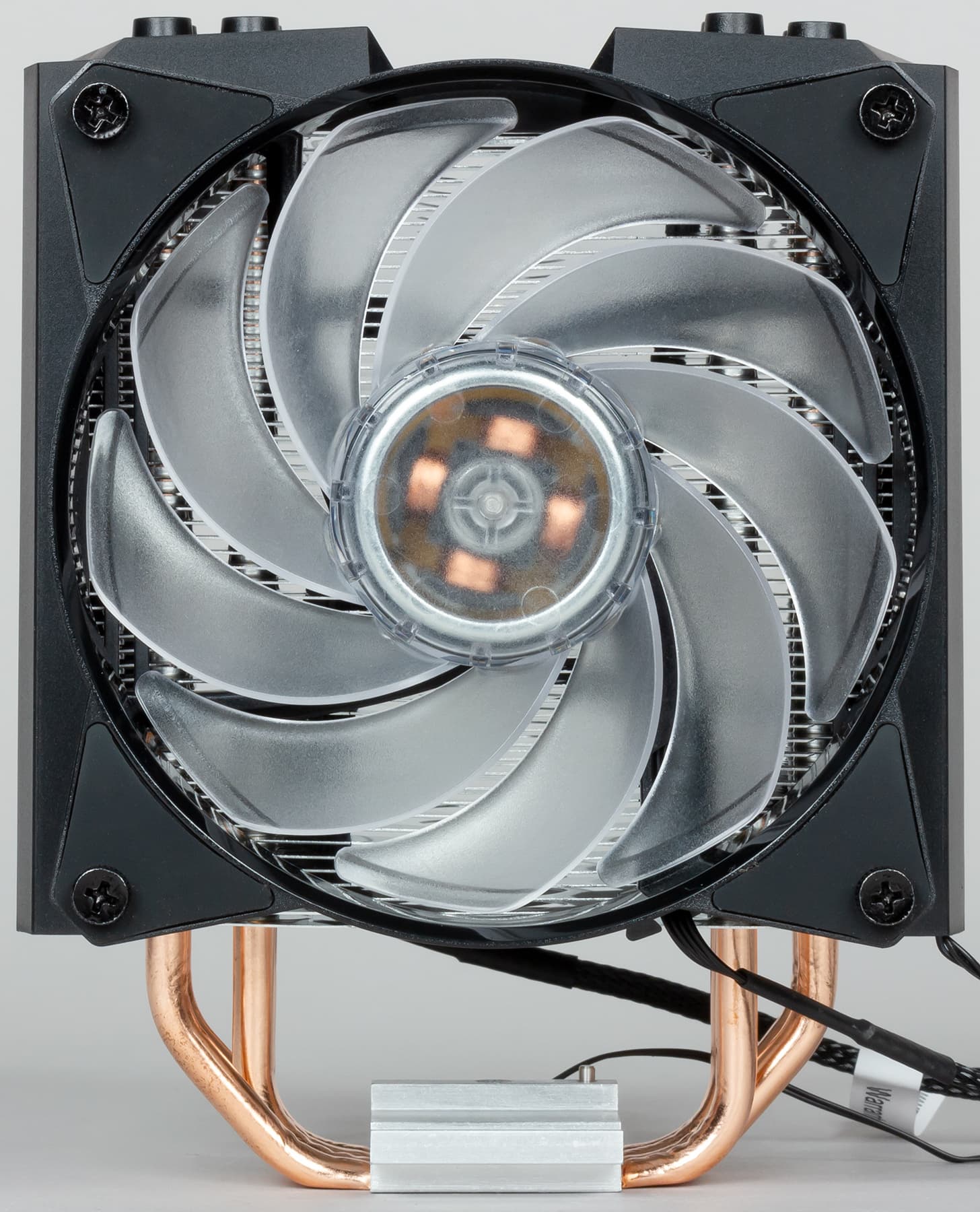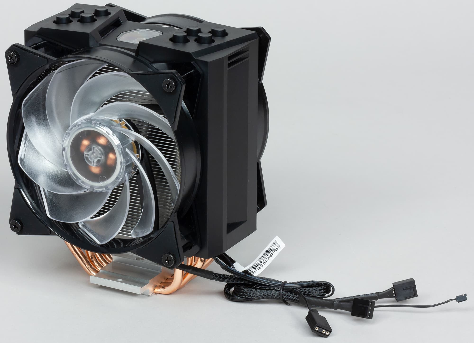Наше тестирование показало, что кулер Cooler Master MasterAir MA410M можно использовать с процессорами, имеющими реальное потребление порядка 135 Вт, при этом даже с учетом возможного повышения температуры внутри корпуса до 44 °C и при условии максимальной нагрузки все равно будет сохраняться очень низкий уровень шума — 25 дБА и ниже. При снижении температуры воздуха и/или менее жестких требованиях к уровню шума предел мощности можно значительно увеличить. К достоинствам кулера следует отнести аккуратный дизайн, антивибрационные прокладки под вентилятор, декоративную оплетку кабеля, габариты, не препятствующие установке модулей памяти с высокими радиаторами (от второго разъема), хорошую комплектацию и, конечно, многоцветную статичную или динамичную подсветку радиатора, в том числе с зависимостью от температуры процессора. К недостаткам отнесем не самое удобное крепление радиатора на процессор, а также то, что вентиляторы практически невозможно снять и поставить обратно, не сорвав резьбу под крепежные винты.