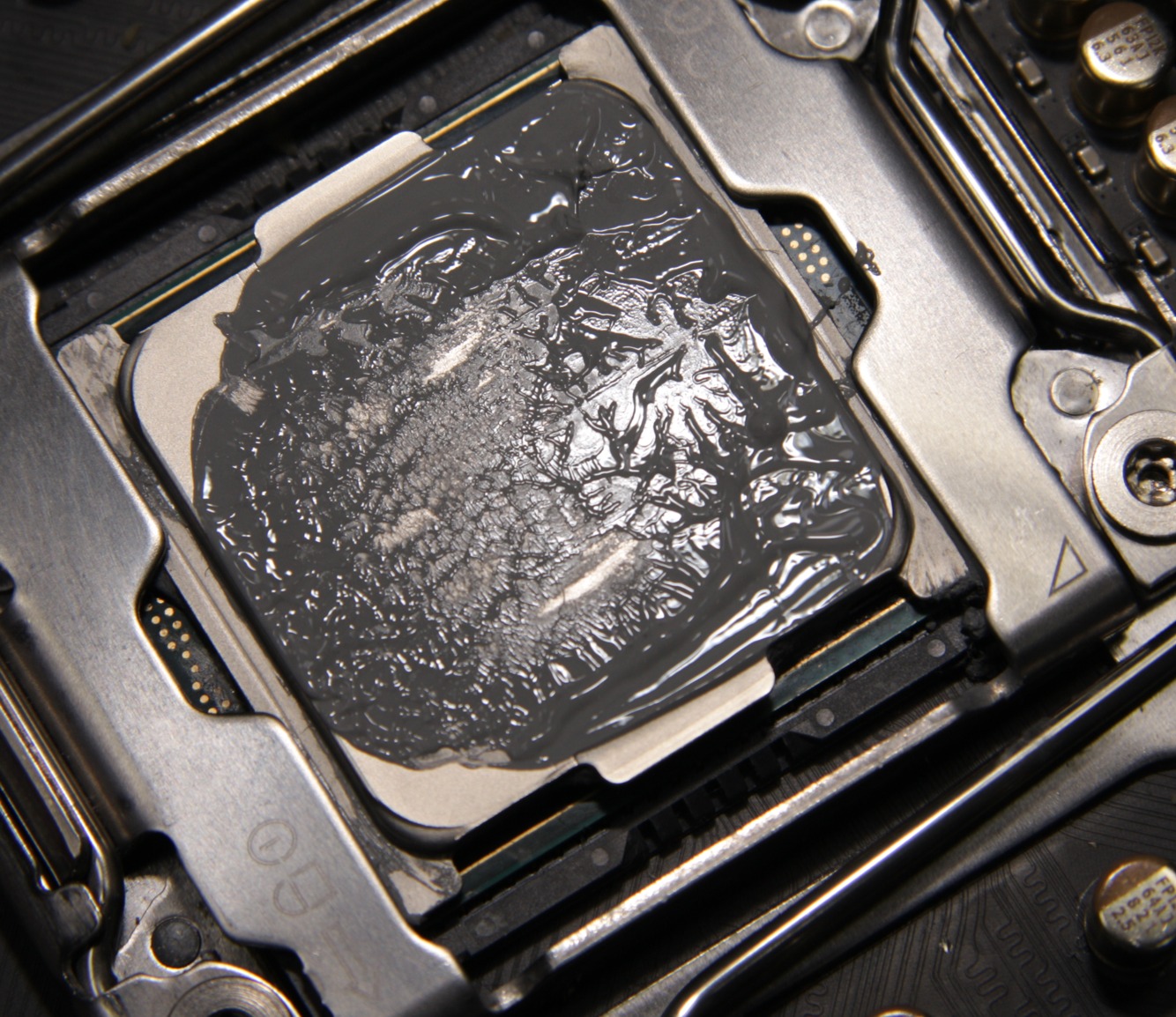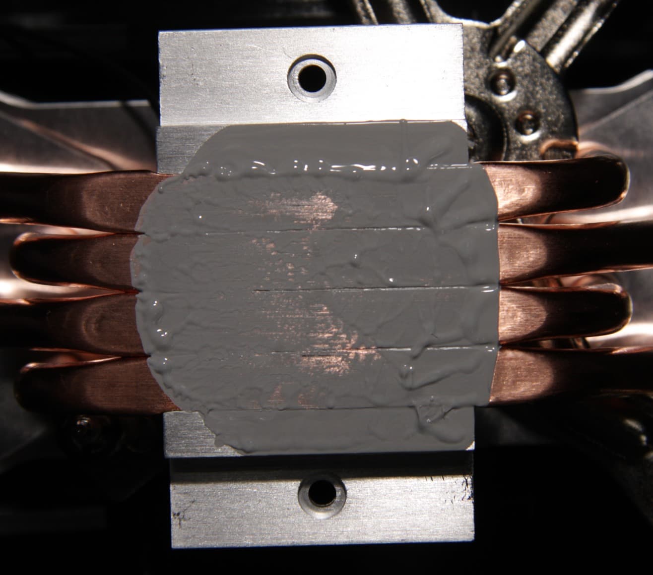 Видно, что термопаста распределилась очень тонким слоем в местах контакта тепловых трубок с центральной частью крышки процессора, а ее избыток выдавился по краям. Очевидно, что в данном случае с термопастой сложно переборщить, так как ее избытки выдавливаются за плоскость подошвы. Отметим, что свежая и после тестов данная термопаста относительно жидкая, липкая и чуть тягучая, она выдавливается гораздо легче, чем счищается.