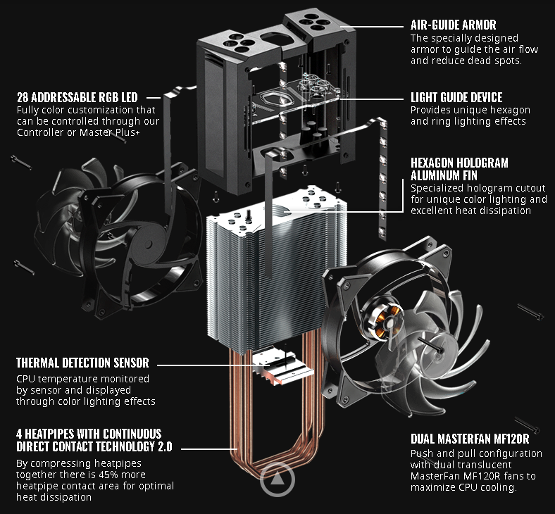 Изнутри на кожухе радиатора вертикально закреплены ленты с 28 адресуемыми RGB-светодиодами. Под кожухом, на крышке, закрывающей верхнюю пластину радиатора и концы тепловых трубок, есть вставка-световод из прозрачного пластика. Взрывная диаграмма с сайта производителя поясняет сложное устройства кулера: