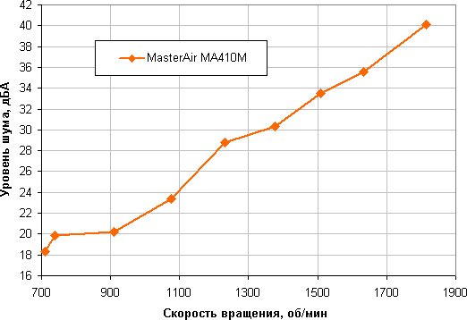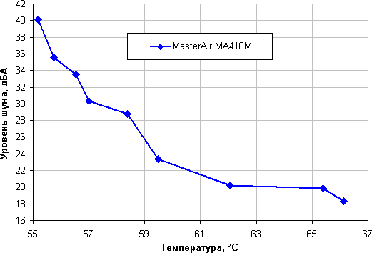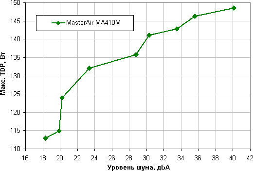 Приняв 25 дБА за критерий условной бесшумности, получим, что примерная максимальная мощность процессора, соответствующего этому уровню, составляет порядка 135 Вт. Если не обращать внимания на уровень шума, предел мощности можно увеличить где-то до 150 Вт. Еще раз уточним, это в жестких условиях обдува радиатора нагретым до 44 градусов воздухом. При снижении температуры воздуха указанные пределы мощности для бесшумной работы и максимальной мощности возрастают.