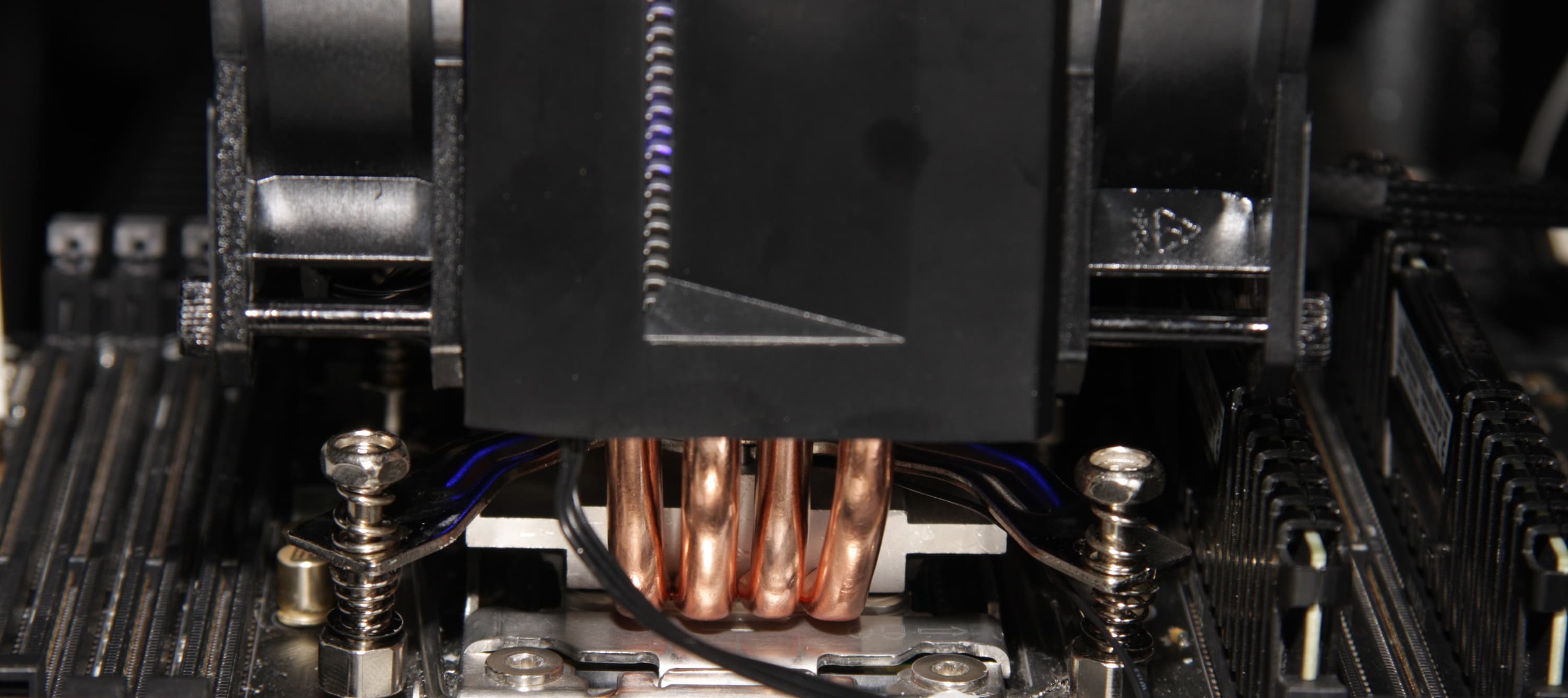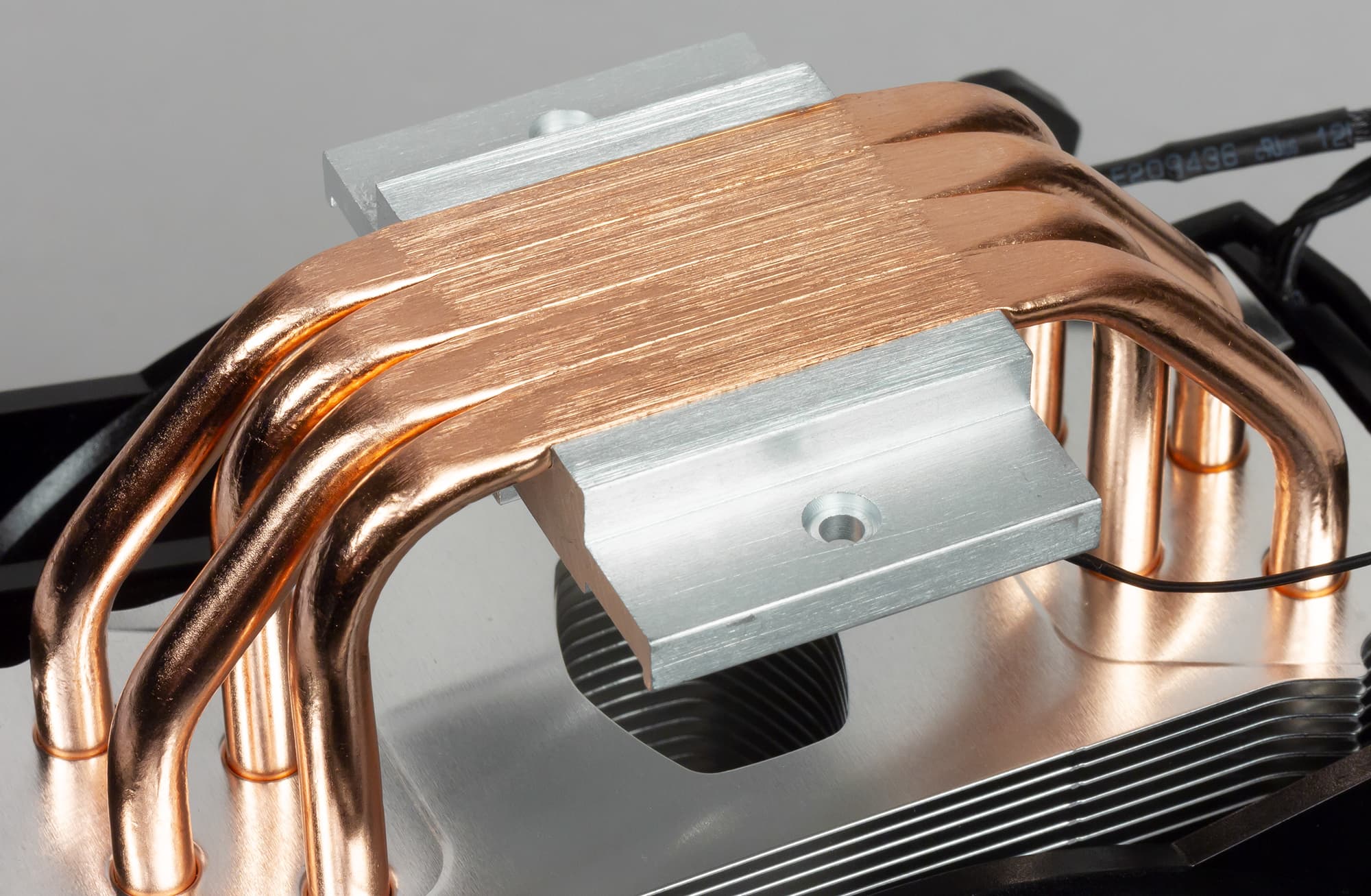 Кулер оснащен вынесенным радиатором, к которому тепло от подошвы передается по четырем тепловым трубкам. Трубки, разумеется, медные. У подошвы теплосъемника трубки сплющены и впрессованы в толстую алюминиевую пластину, снаружи анодированную.