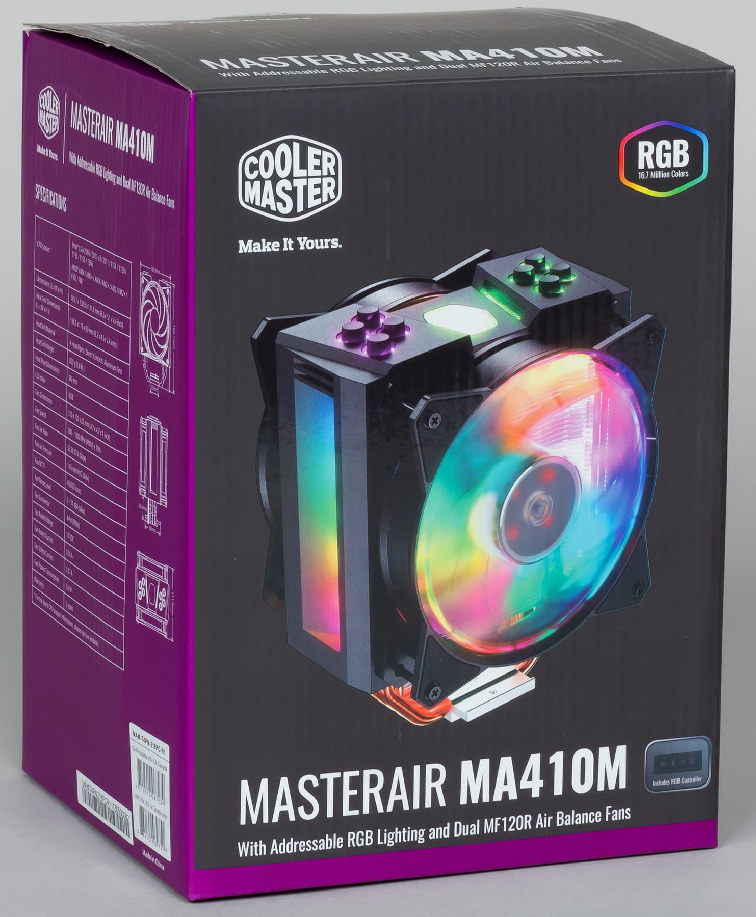 Поставляется процессорный охладитель Cooler Master MasterAir MA410M в красочно оформленной коробке из тонкого гофрированного картона.