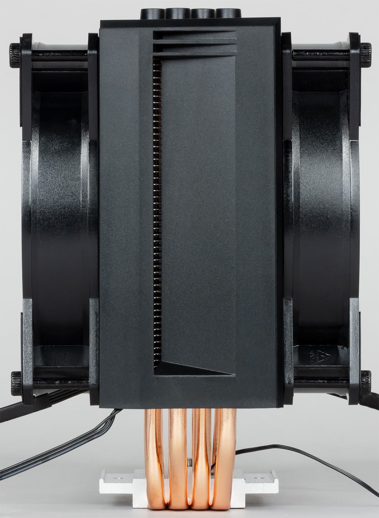 Один вентилятор нагнетает воздух, второй — выдувает. При этом вентиляторы не просто развернуты, а оснащены крыльчатками с различающейся геометрией, поэтому оба вентилятора повернуты тыльной стороной к радиатору. Вентиляторы закреплены на кожухе с помощью длинных винтов с накатными головками. Резьба на винтах мелкая и короткая, а пластик кожуха относительно мягкий, поэтому при небольшом усилии и даже просто при откручивании резьба в отверстиях в кожухе срывается. По возможности лучше вентиляторы с кожуха не снимать.