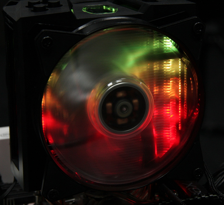 Свет от светодиодов отражается от пластин радиатора и преломляется в прозрачной вставке. В итоге свечение видно спереди и сзади через прозрачные крыльчатки вентиляторов, с боков через вертикальную прорезь в кожухе, и сверху, через отверстия в кожухе, при этом гексагональные отверстия в пластинах радиатора формируют светящийся тоннель.