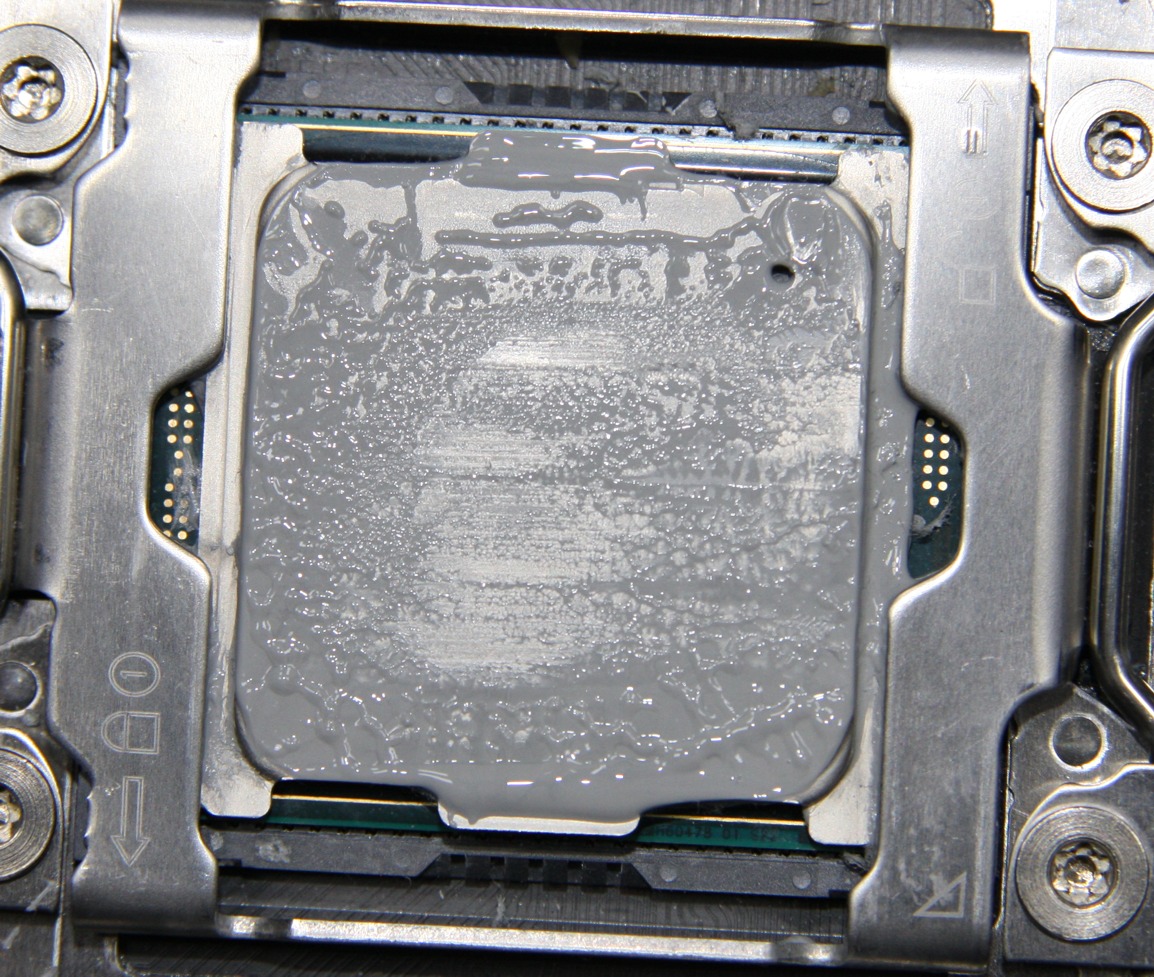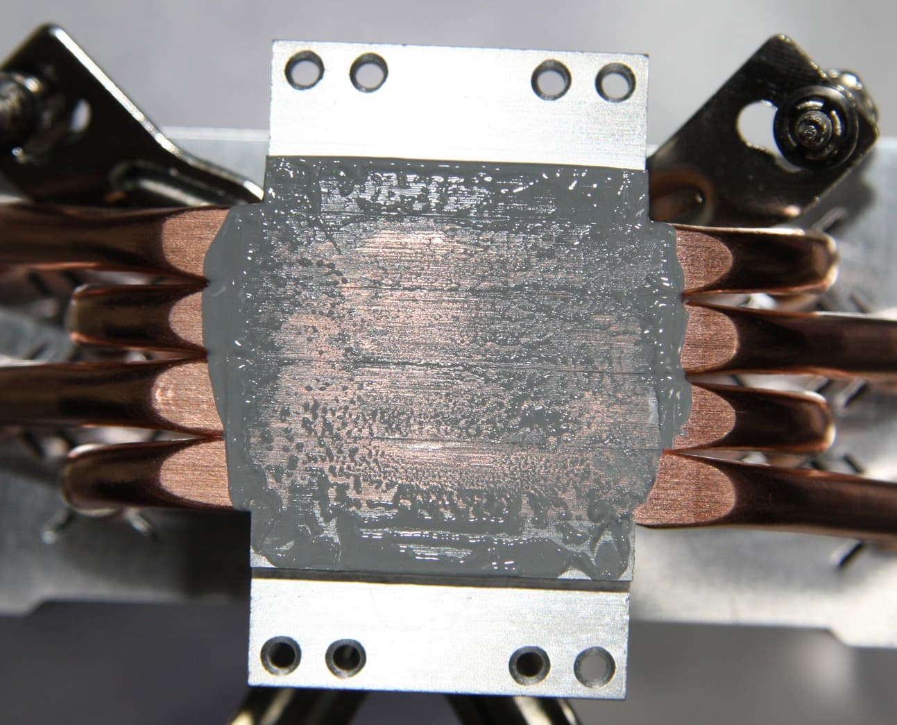 Видно, что термопаста распределилась очень тонким слоем в местах контакта тепловых трубок с центральной частью крышки процессора, а ее избыток выдавился по краям. Очевидно, что в данном случае с термопастой сложно переборщить, так как ее избытки выдавливаются за плоскость подошвы. Отметим, что свежая и после тестов данная термопаста относительно жидкая, липкая и чуть тягучая, она выдавливается гораздо легче, чем счищается.