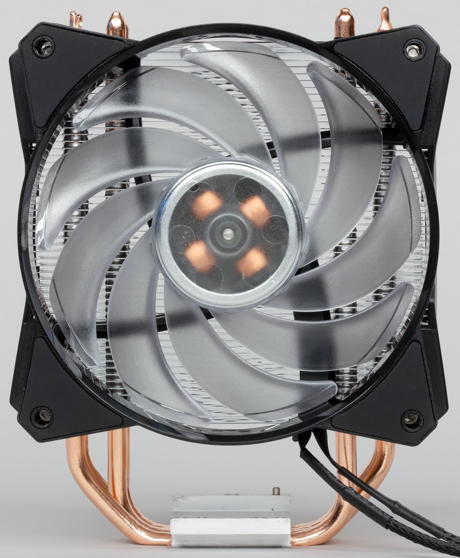 Наше тестирование показало, что кулер Cooler Master MasterAir MA410P можно использовать с процессорами, имеющими реальное потребление порядка 125 Вт, при этом даже с учетом возможного повышения температуры внутри корпуса до 44 °C и при условии максимальной нагрузки все равно будет сохраняться очень низкий уровень шума — 25 дБА и ниже. К достоинствам кулера следует отнести аккуратный дизайн, хорошее качество изготовления, удобный крепеж вентилятора на радиатор, антивибрационные прокладки под вентилятор, декоративную оплетку кабеля, габариты, не препятствующие установке модулей памяти с высокими радиаторами, хорошую комплектацию и, конечно, многоцветную статичную или динамичную подсветку крыльчатки вентилятора. К недостаткам отнесем не самое удобное крепление радиатора на процессор.