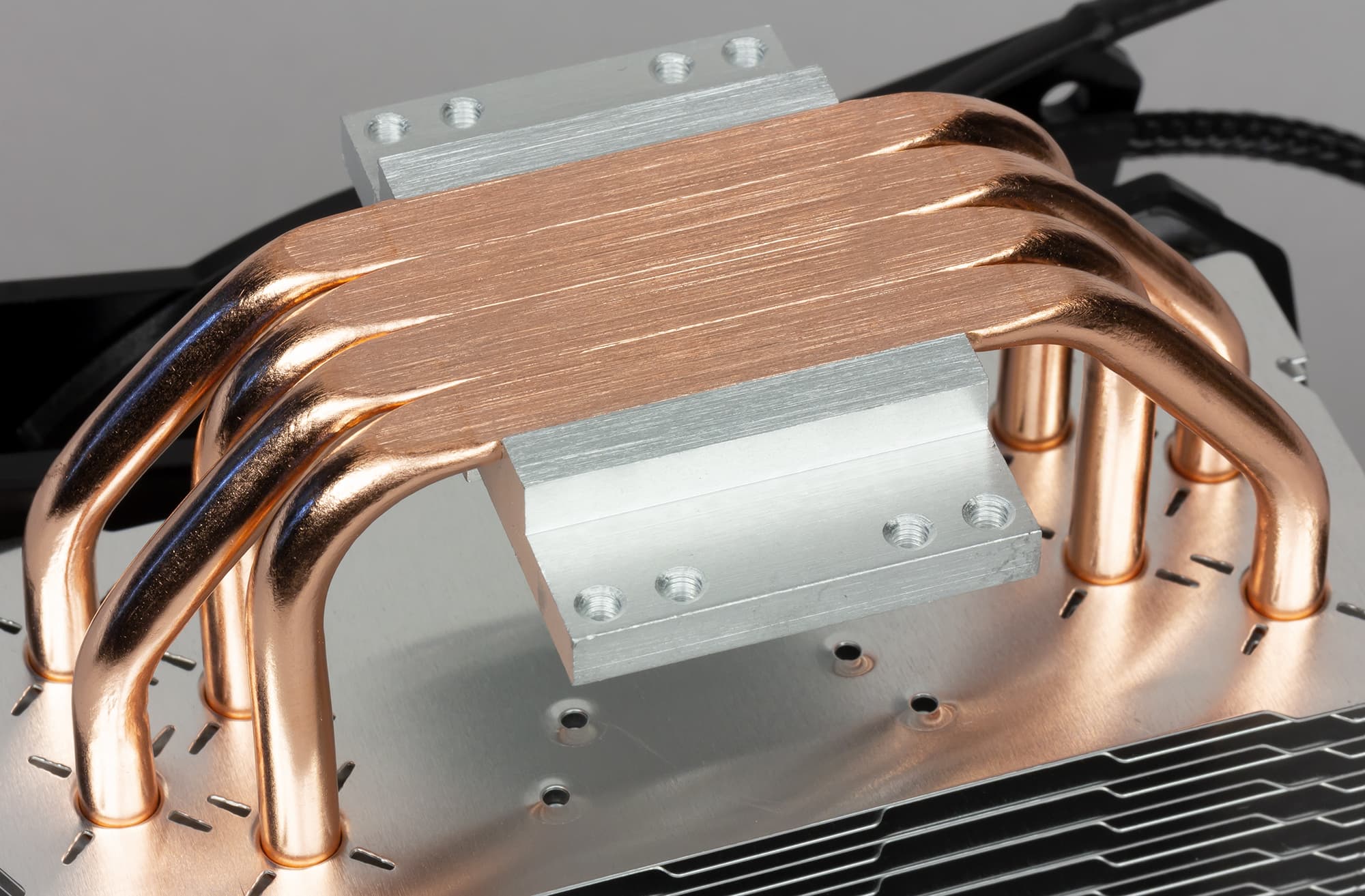Кулер оснащен вынесенным радиатором, к которому тепло от подошвы передается по четырем тепловым трубкам. Трубки, разумеется, медные. У подошвы теплосъемника трубки сплющены и впрессованы в толстую алюминиевую пластину, снаружи анодированную.