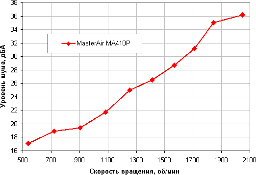 В этом тесте мы изменяли только КЗ, зафиксировав напряжение на уровне 12 В. Перегибы на графике явно соответствуют каким-то резонансным явлениям, впрочем, в данном случае выраженного гула или неприятных призвуков нет. Этот кулер можно считать тихим устройством. Зависит, конечно, от индивидуальных особенностей и других факторов, но в случае кулеров где-то от 40 дБА и выше шум с нашей точки зрения очень высокий для настольной системы, от 35 до 40 дБА уровень шума относится к разряду терпимых, ниже 35 дБА шум от системы охлаждения не будет сильно выделяться на фоне типичных небесшумных компонентов ПК — вентиляторов корпусных, на блоке питания, на видеокарте, а также жестких дисков, а где-то ниже 25 дБА кулер можно назвать условно бесшумным.