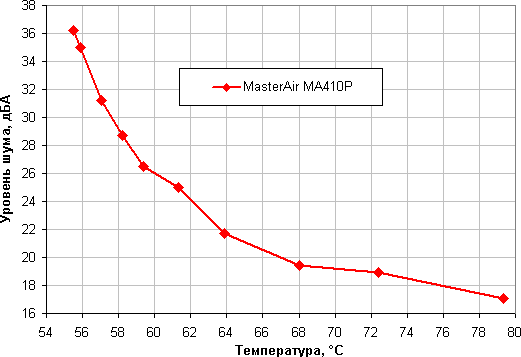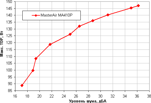 Приняв 25 дБА за критерий условной бесшумности, получим, что примерная максимальная мощность процессора, соответствующего этому уровню, составляет порядка 125 Вт. Еще раз уточним, это в жестких условиях обдува радиатора нагретым до 44 градусов воздухом, при снижении температуры воздуха указанные пределы мощности для бесшумной работы и максимальной мощности возрастают. Гипотетически, если не обращать внимания на уровень шума, предел мощности можно увеличить где-то на 20 Вт.