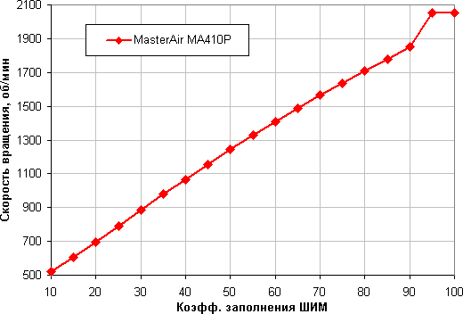Диапазон регулировки широкий от 10% до 95% с плавным и практически линейным ростом скорости вращения, а при снижении коэффициента заполнения (КЗ) ниже 8% вентилятор останавливается и запускается при повышении до 12%. Это может иметь значение, если пользователь хочет создать гибридную систему охлаждения, которая при низкой нагрузке работает полностью или частично в пассивном режиме.