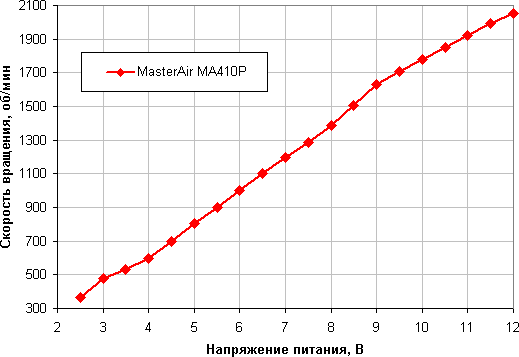 Диапазон регулировки также широкий и регулировка с помощью напряжения позволяет получить устойчивое вращение на более низких скоростях. Вентилятор останавливается при снижении напряжения до 2,2 В и запускается от 2,3 В.