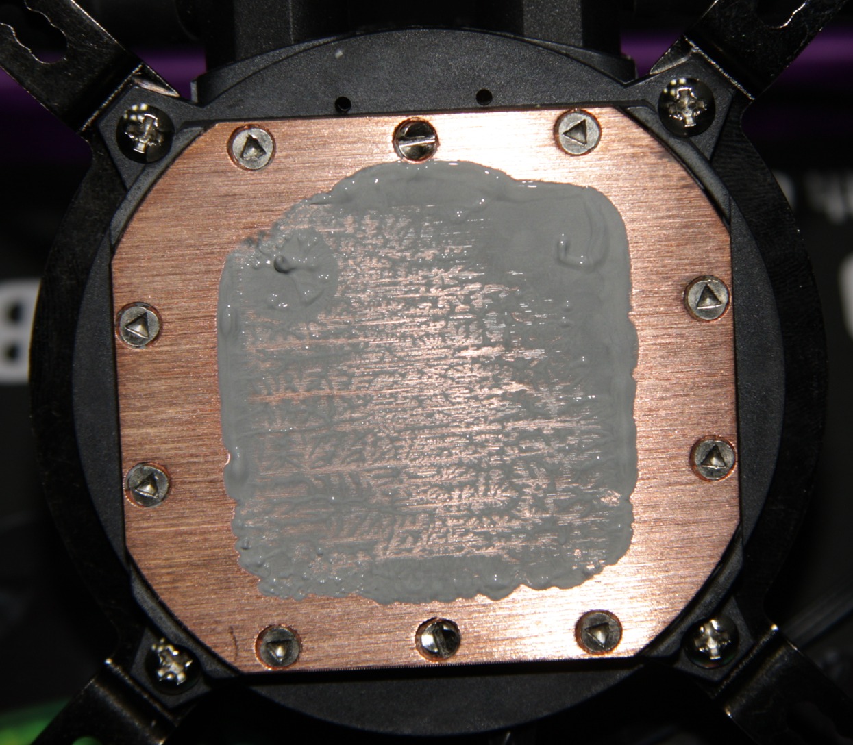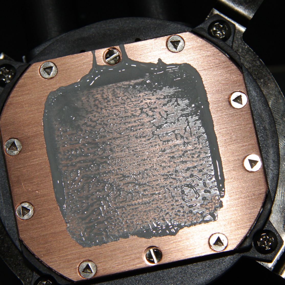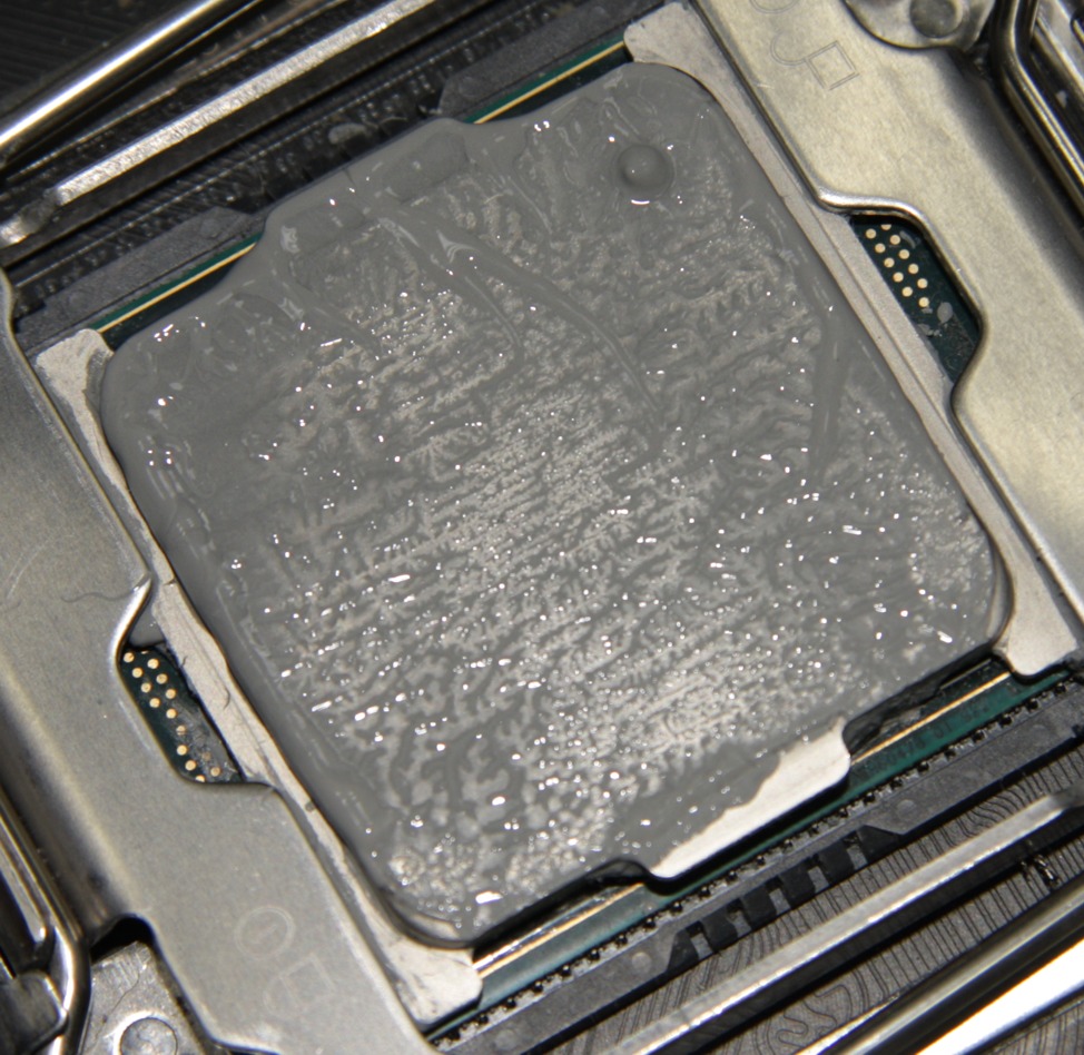 Видно, что термопаста распределилась очень тонким слоем на большей части (и главное в центре) площади крышки процессора, а ее избытки выдавились за края.