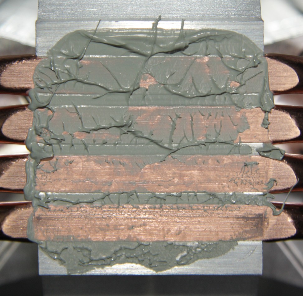 Преднанесенного термоинтерфейса нет, но производитель приложил к кулеру небольшой шприц с термопастой MasterGel Pro. Комплектного запаса термопасты должно хватить раза на два в случае процессоров с небольшой площадью крышки и при экономном расходе. В тестах использовалась не менее качественная термопаста другого производителя. Забегая вперед, продемонстрируем распределение термопасты после завершения всех тестов. На процессоре Intel Core i9-7980XE: