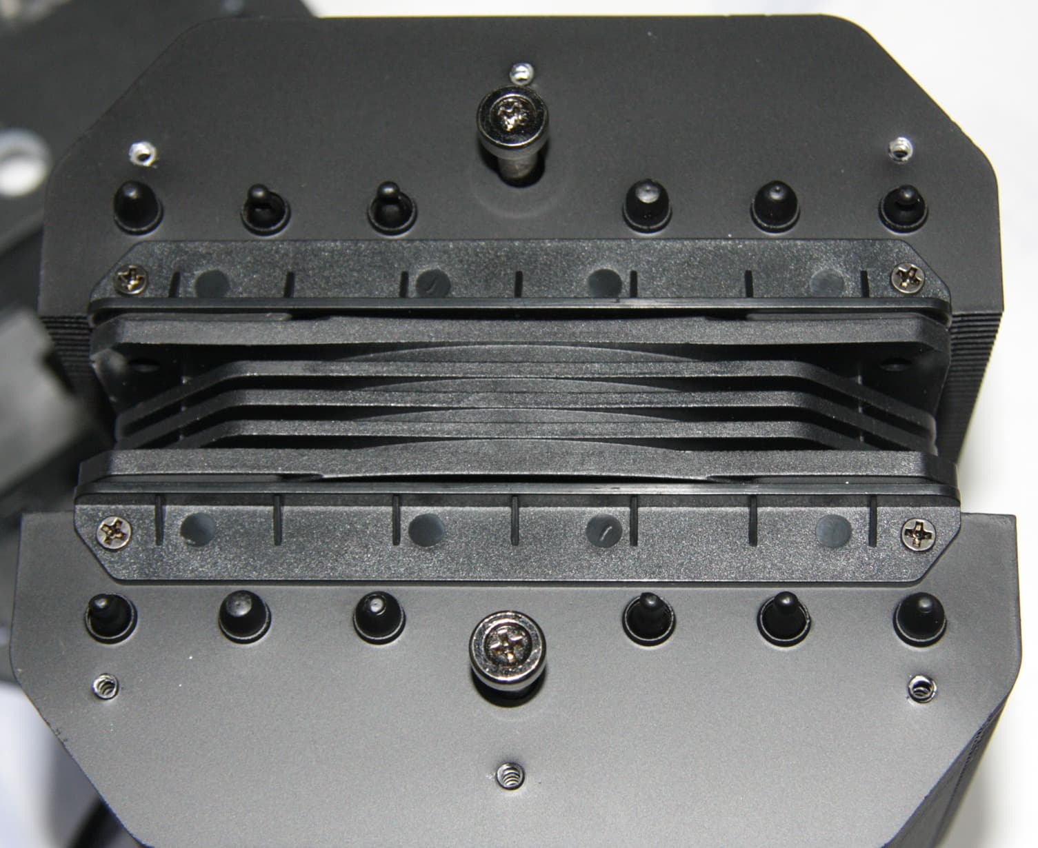 Снизу вентилятор никак не фиксируется и болтается с небольшим люфтом. Дребезг и стук рамки вентилятора о пластины радиатора гасят резиновые накладки около отверстий в рамке. По габаритам — это вентилятор распространенного типоразмера 120 мм с толщиной рамки 25 мм. Если по какой-то причине вентилятор придется менять, то резиновые накладки нужно или переклеить на новый вентилятор, или чем-то заменить.