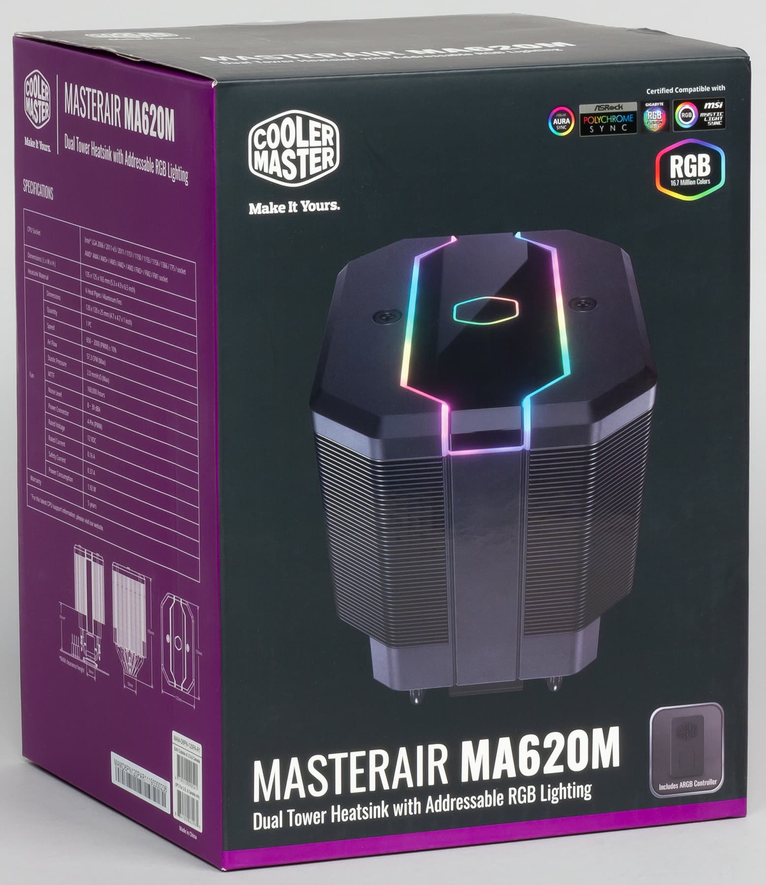 С использованием кулера Cooler Master MasterAir MA620M можно создать условно бесшумный компьютер (уровень шума 25 дБА и ниже), оснащенный процессором типа Intel Core i9-7980XE (Intel LGA2066, Skylake-X (HCC)), если потребление процессора под максимальной нагрузкой не будет превышать 175 Вт, а температура внутри корпуса не повысится выше 44 °C. В случае чиплетового процессора AMD Ryzen 9 3950X эффективность кулера заметно ниже, и для соблюдения указанных выше условий максимальная мощность, потребляемая процессором, должна быть ниже 113 Вт. При снижении температуры охлаждающего воздуха и/или менее жестких требованиях к уровню шума пределы мощности можно существенно увеличить. Кулер отличается аккуратным внешним видом и наличием скромной, но многоцветной и многозонной подсветки, очень удобной установкой, возможностью использования совместно с модулями памяти с высокими радиаторами.