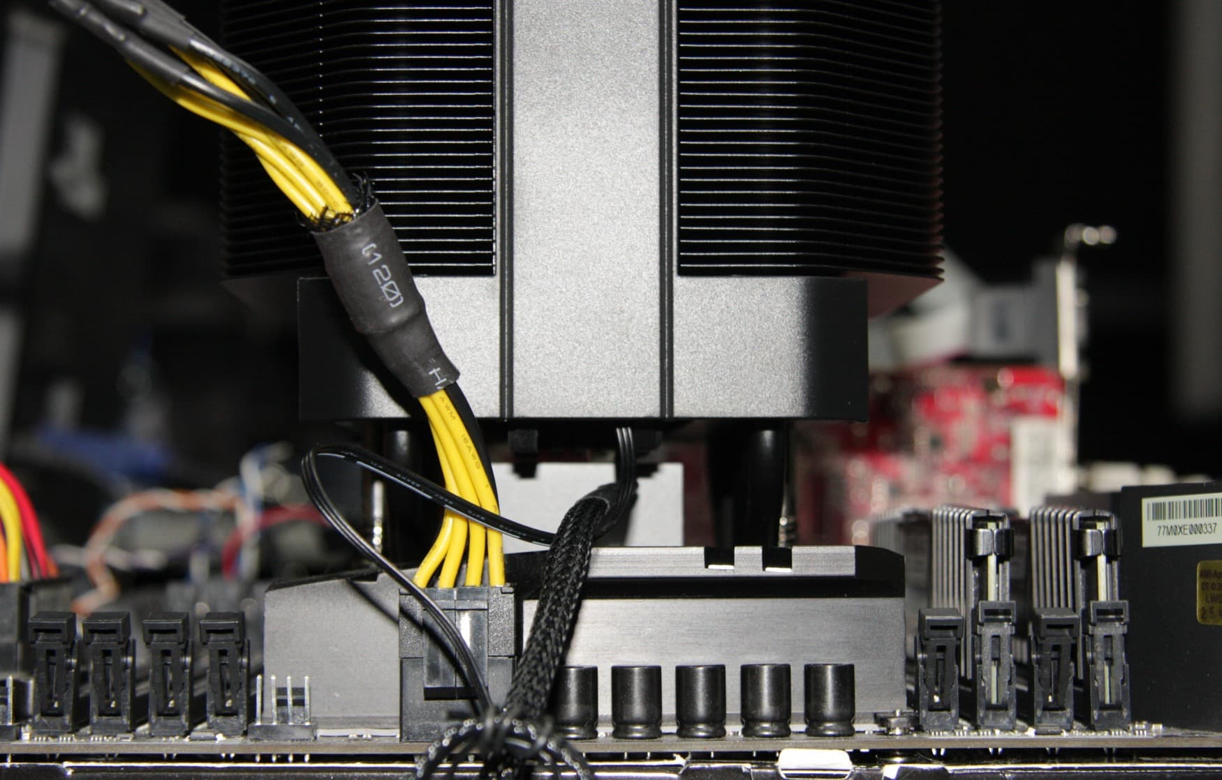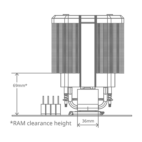 Несмотря на весьма внушительные габариты, кулер совсем не препятствует установке модулей памяти с нормальной и увеличенной высотой, так как в нижней части глубина радиатора уменьшена. Согласно данным производителя, кулер позволяет устанавливать модули оперативной памяти высотой до 69 мм.