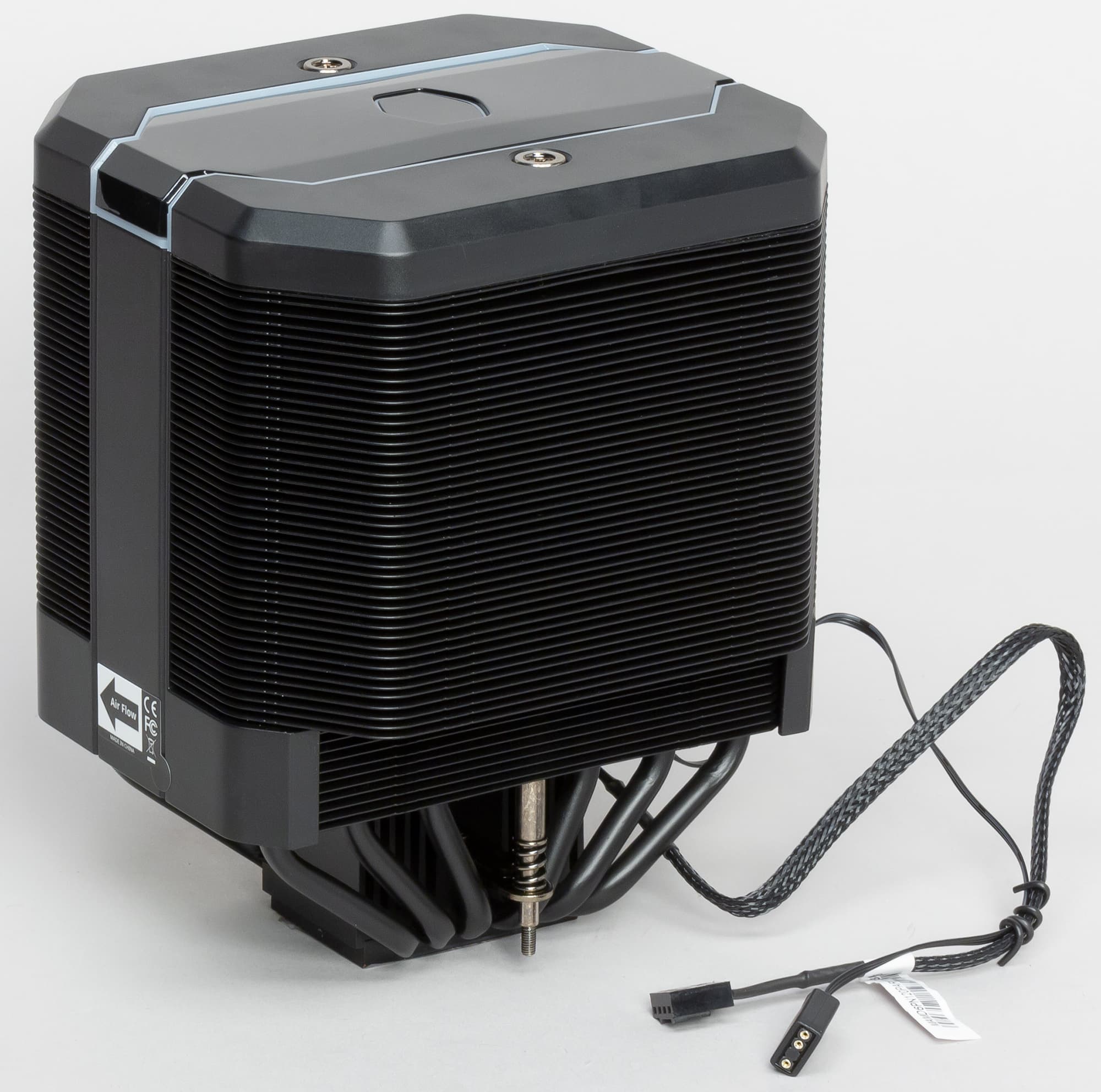 Внешне кулер напоминает уменьшенную копию процессорного охладителя Cooler Master Wraith Ripper. Кулер оснащен вынесенным двойным радиатором, к которому тепло от теплосъемника передается по шести U-образным тепловым трубкам диаметром 6 мм. Между половинками радиатора установлен вентилятор. Теплосъемник и трубки медные, а ребра радиатора изготовлены из алюминиевого листа толщиной 0,4 мм, и, по всей видимости, никелированы. Теплосъемник, трубки и ребра радиатора, скорее всего, припаяны друг к другу, что обеспечивает хороший тепловой контакт. Почти все металлические элементы кулера имеют черное стойкое матовое покрытие. Такое покрытие несколько увеличивает отдачу тепла за счет излучения, особенно в сравнении с блестящими металлическими поверхностями без покрытия. Впрочем, на рабочих температурах этого кулера вклад теплового излучения невелик. Покомпонентный рисунок с сайта производителя поясняет устройство кулера.