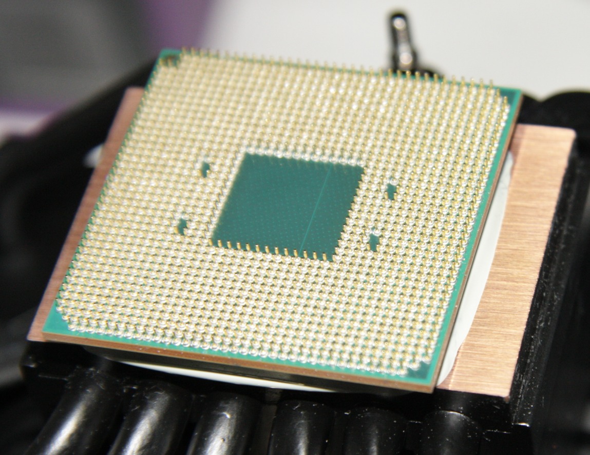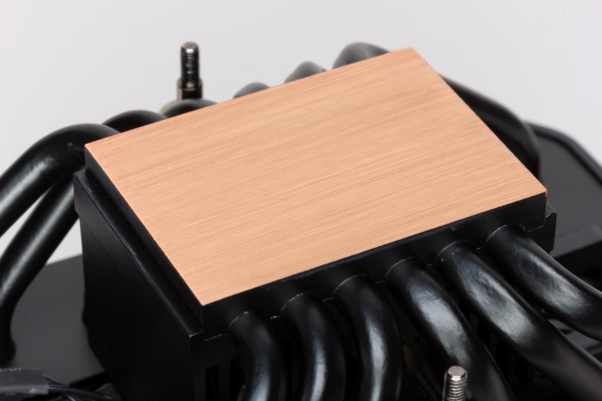 Теплосъемник состоит металлического радиатора (возможно, это алюминий с никелированной поверхностью) сверху и медной пластины снизу. Тепловые трубки проходят в канавках между этими двумя деталями.