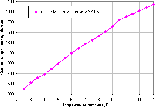 Диапазон регулировки с помощью напряжения заметно шире: можно получить устойчивое вращение на более низких скоростях. Вентилятор останавливается при снижении напряжения до 2,1 В и запускается от 2,4 В. В случае необходимости вентилятор можно подключить к источнику с напряжением 5 В.