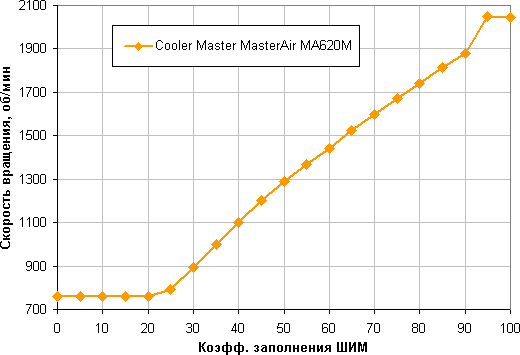Диапазон регулировки по скорости вращения и по рабочему диапазону изменения коэффициента заполнения (КЗ) довольно широкий — от 20% до 95% с плавным и близким к линейному ростом скорости вращения. При снижении до КЗ 0 вентилятор не останавливается. Это может иметь значение, если пользователь хочет создать гибридную систему охлаждения, которая при низкой нагрузке работает полностью или частично в пассивном режиме.